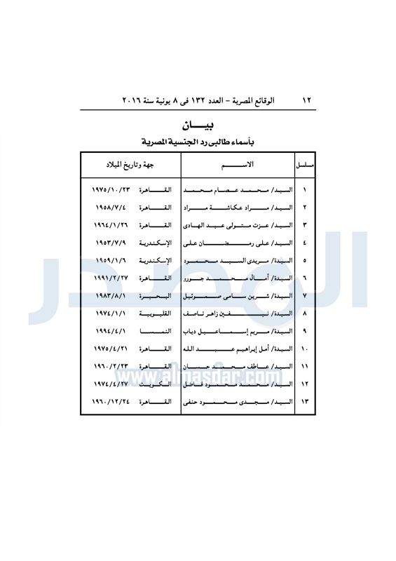كما تم رد الجنسية المصرية لـ 13 شخصًا.