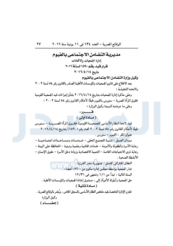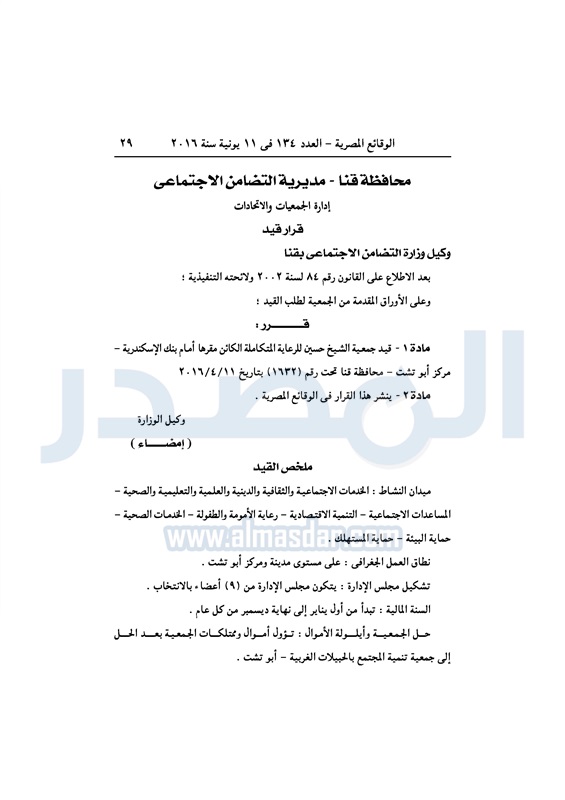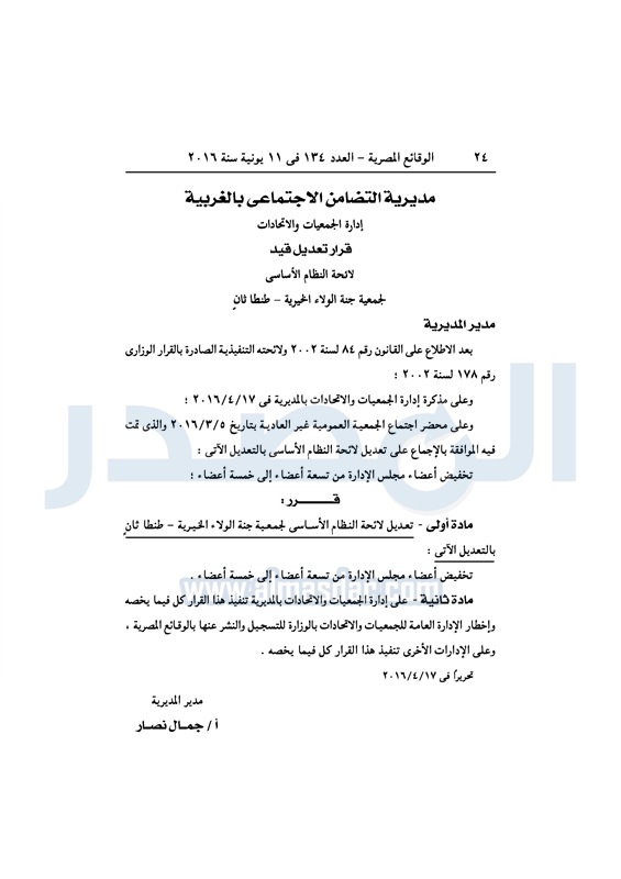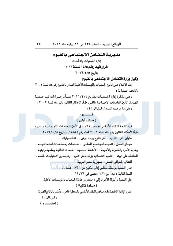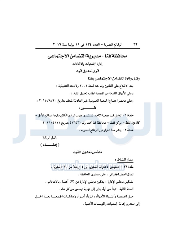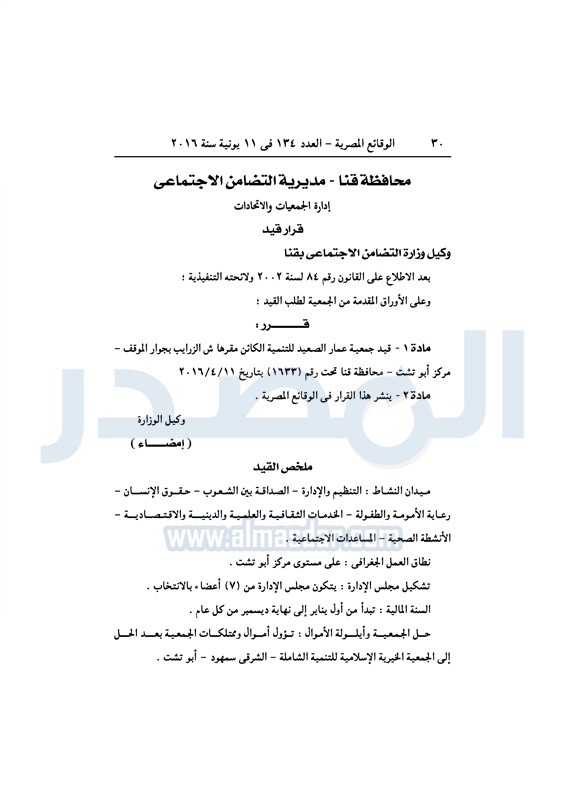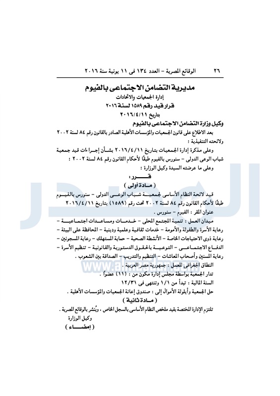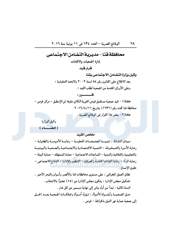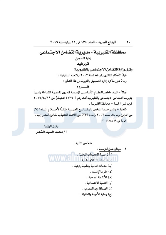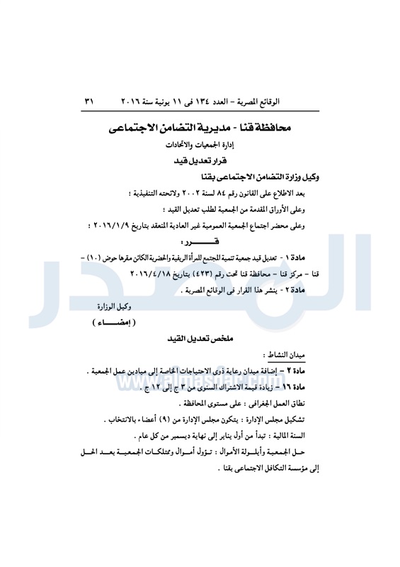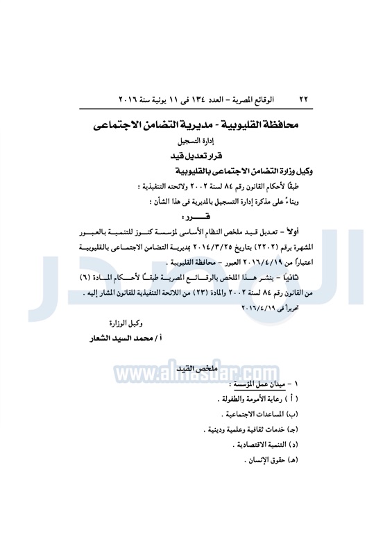 محافظات التضامن الاجتماعي تقيد عددًا من الجمعيات في المحافظات الأحد 12 يونيو 2016 - 10:02 ص 6/12/2016 10:02:00 AM وزارة التضامن الاجتماعي - صورة أرشيفية المصدر - خاص طباعة شارك نشرت الوقائع المصرية، في العدد رقم 134، الصادر في 11 يونيو 2016، قرارات وزارة التضامن الاجتماعي، ومديريات التضامن في عدد من المحافظات، بشأن قيد وشهر عدد من الجمعياتلقراءة القرار: طباعة شارك لائحة النظام الأساسي جمعيات الوقائع المصرية التضامن الاجتماعي تابع المصدر علي جوجل نيوز تطبيق نبض