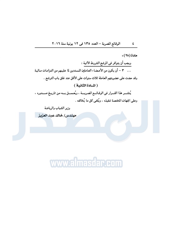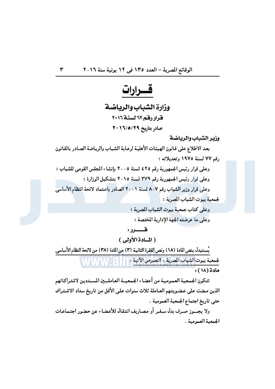 رياضة وزارة الرياضة تعدل النظام الأساسي لجمعية بيوت الشباب الأحد 12 يونيو 2016 - 10:50 ص 6/12/2016 10:50:00 AM خالد عبد العزيز وزير الشباب والرياضة المصدر - خاص طباعة شارك نشرت الوقائع المصرية، في العدد رقم 135، الصادر في 12 يونيو 2016، قرار وزارة الشباب والرياضة، رقم 62 لسنة 2016، بشأن تعديل لائحة النظام الأساسي لجمعية بيوت الشباب المصرية.لقراءة القرار: طباعة شارك وزاره الشباب والرياضه لائحة النظام الأساسي رياضة الوقائع المصرية الشباب تابع المصدر علي جوجل نيوز تطبيق نبض