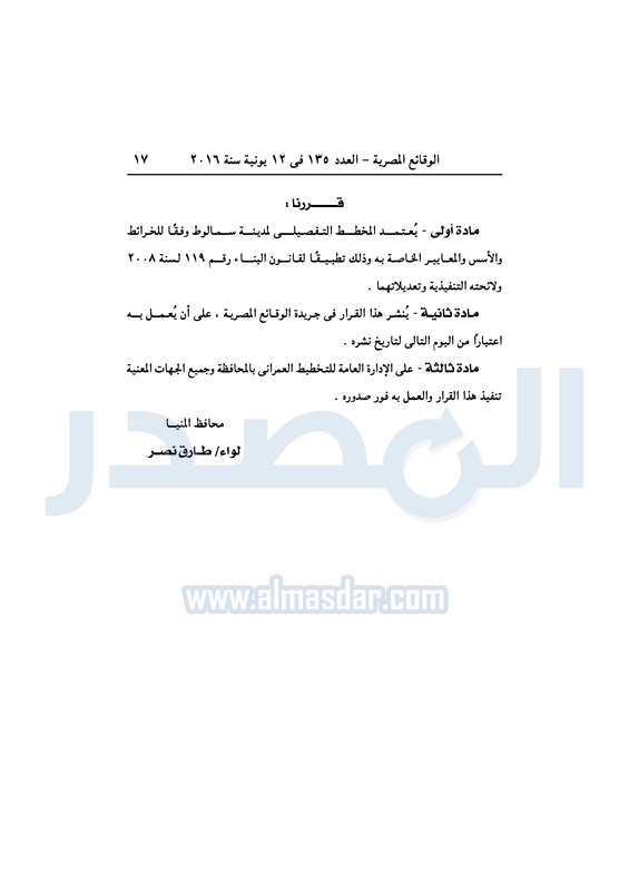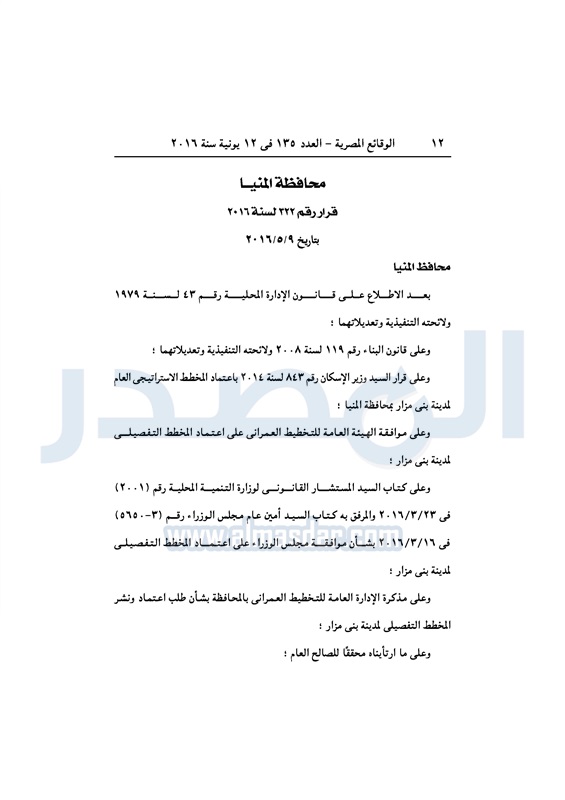 محافظات محافظة المنيا تعتمد المخطط التفصيلي لمدينة بني مزار الأحد 12 يونيو 2016 - 10:54 ص 6/12/2016 10:54:00 AM طارق نصر محافظ المنيا المصدر - خاص طباعة شارك نشرت الوقائع المصرية، في العدد رقم 135، الصادر في 12 يونيو 2016، قرارات محافظة المنيا، رقم 322، و323 لسنة 2016، بشأن اعتماد المخطط التفصيلي لمدينتي بني مزار وسمالوط.لقراءة القرار: طباعة شارك بني مزار الوقائع المصرية المنيا المخطط التفصيلي تابع المصدر علي جوجل نيوز تطبيق نبض