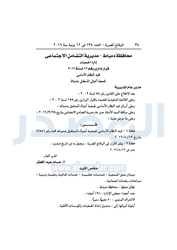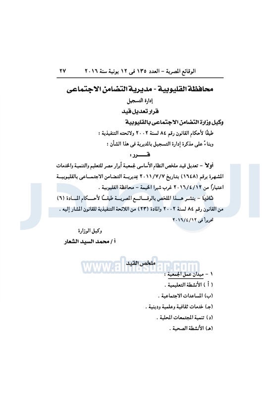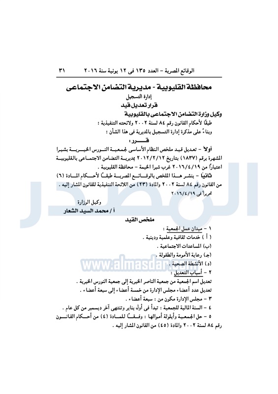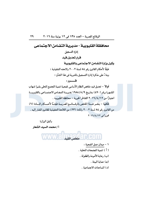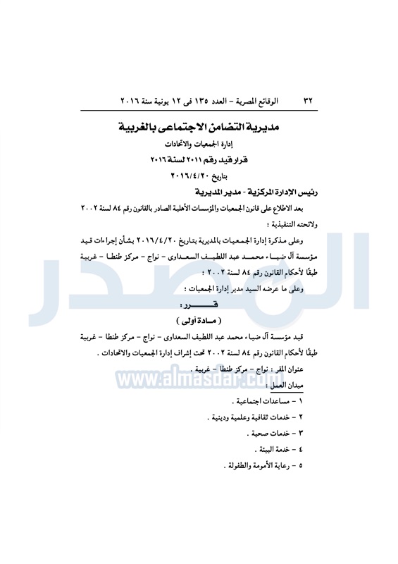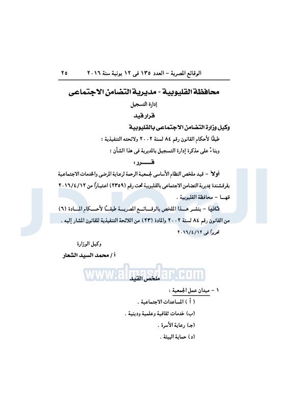 محافظات التضامن تقيد عددًا من الجمعيات في 5 محافظات الأحد 12 يونيو 2016 - 11:22 ص 6/12/2016 11:22:00 AM وزارة التضامن الاجتماعي - صورة أرشيفية المصدر - خاص طباعة شارك نشرت الوقائع المصرية، في العدد رقم 135، الصادر في 12 يونيو 2016، قرارات وزارة التضامن الاجتماعي، ومديريات التضامن في عدد من المحافظات، بشأن قيد وشهر عدد من الجمعيات.لقراءة القرار: طباعة شارك جمعيات الوقائع المصرية التضامن الاجتماعي أخبار مصر تابع المصدر علي جوجل نيوز تطبيق نبض