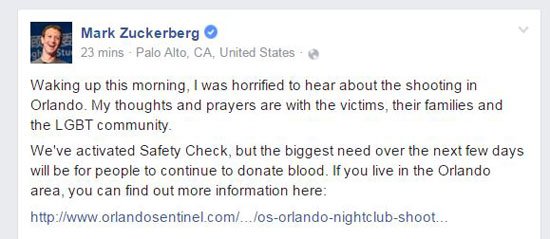 أعلن "مارك زوكربيرج" الرئيس التنفيذى لموقع التواصل الاجتماعي "فيس بوك"، عبر منشور على صفحته الرسمية، عن تفعيل خاصية safety check أوالأمان فى مدينة أورلاندو الواقعة بمقاطعة أورينج فى وسط ولاية فلوريدا الأمريكية، في أعقاب هجوم نفذه الأمريكى من أصل أفغانى "عمر متين" أسفر عن مقتل 50 شخصًا وإصابة 53 آخرين، خلال هجوم مسلح على ملهى للمثليين جنسيًا.