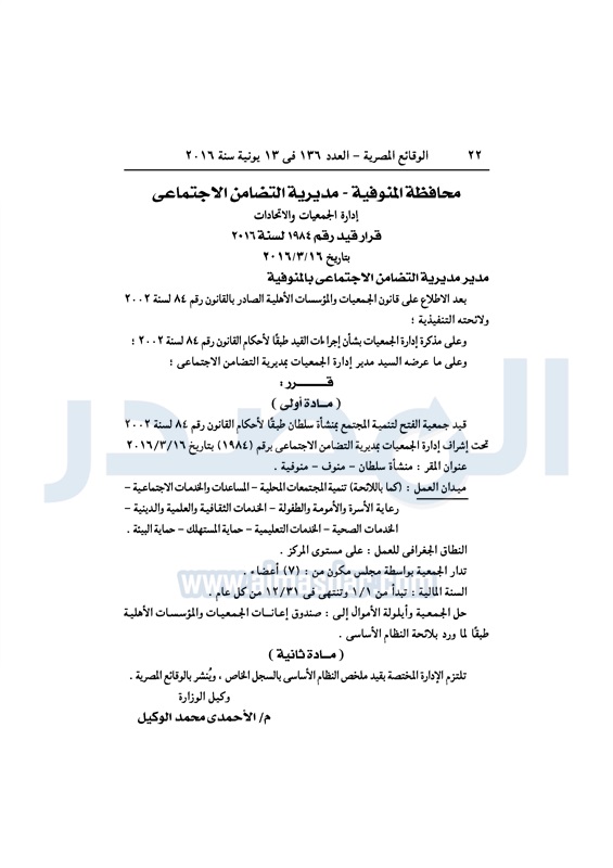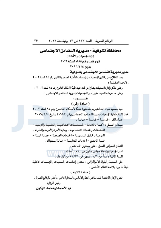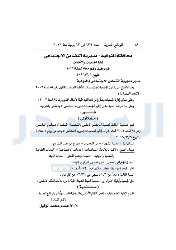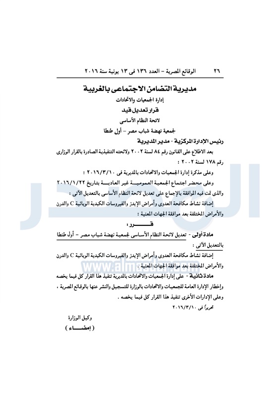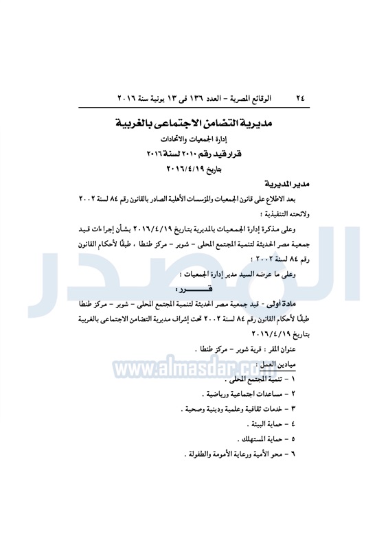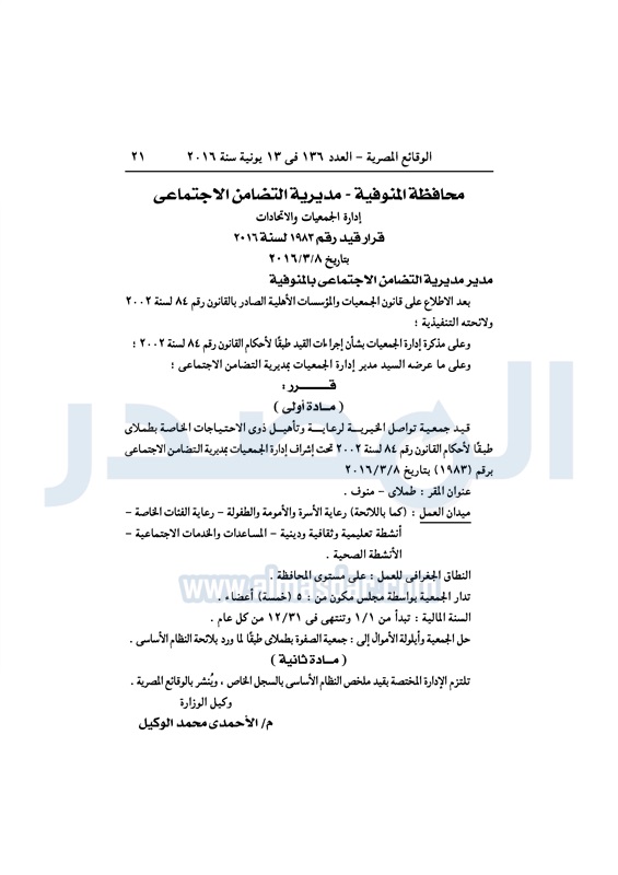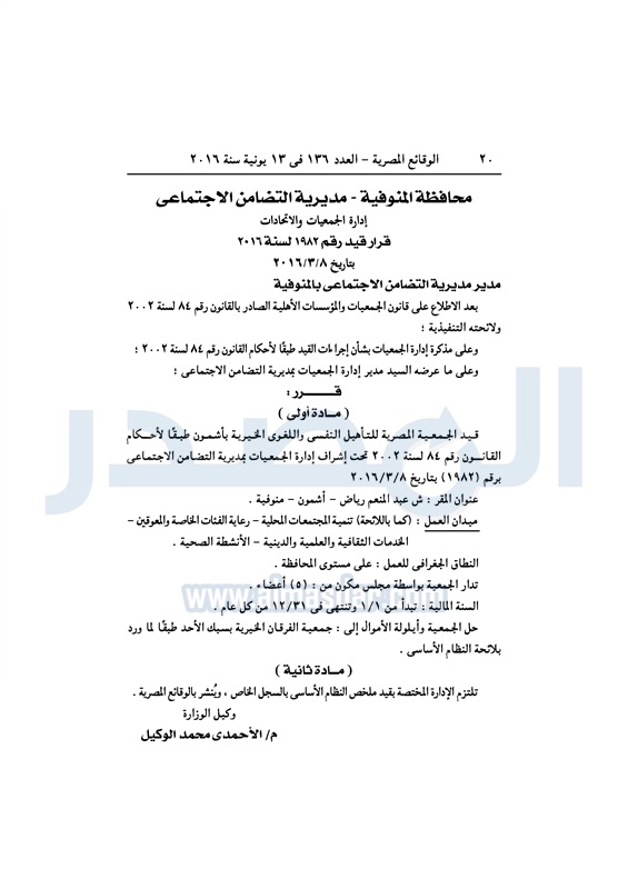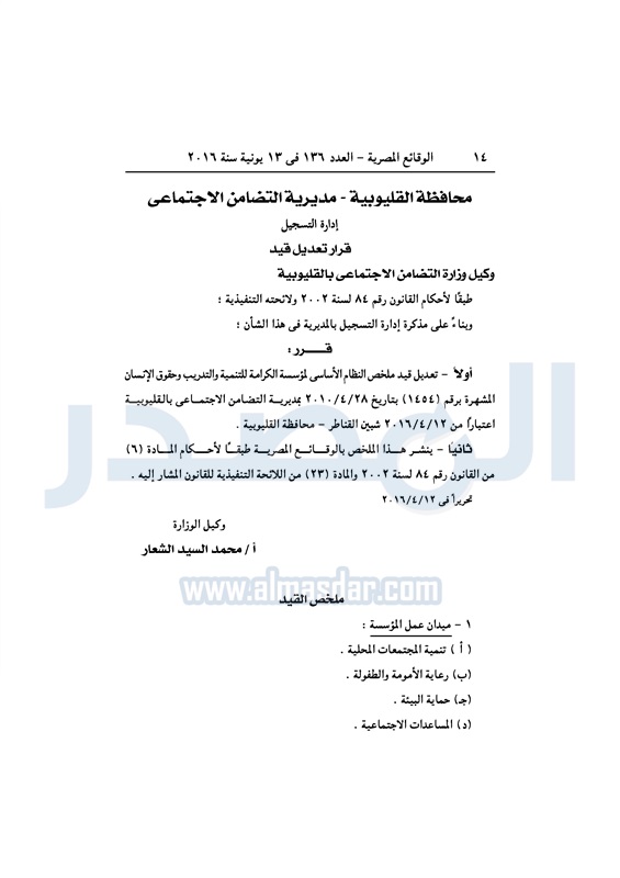 نشرت الوقائع المصرية، في العدد رقم 136، الصادر في 13 يونيو 2016، قرارات وزارة التضامن الاجتماعي، ومديريات التضامن في عدد من المحافظات، بشأن قيد وشهر عدد من الجمعيات.