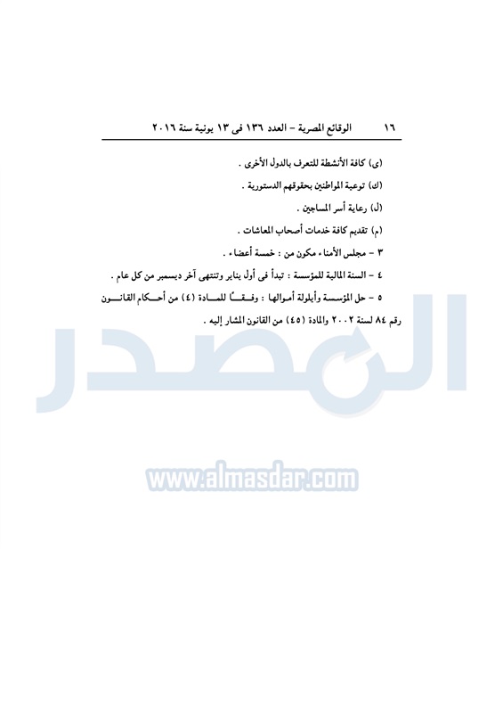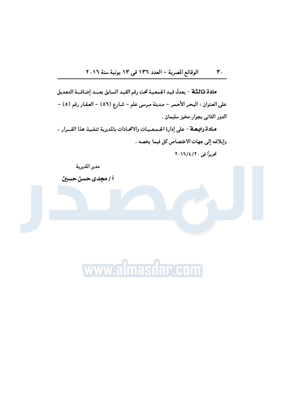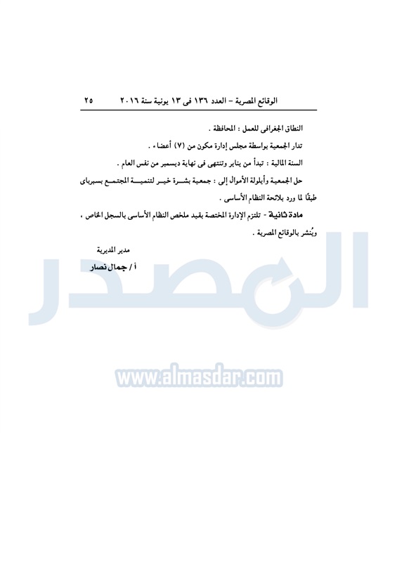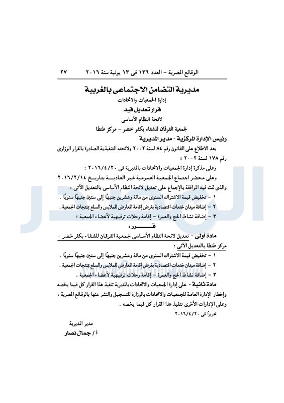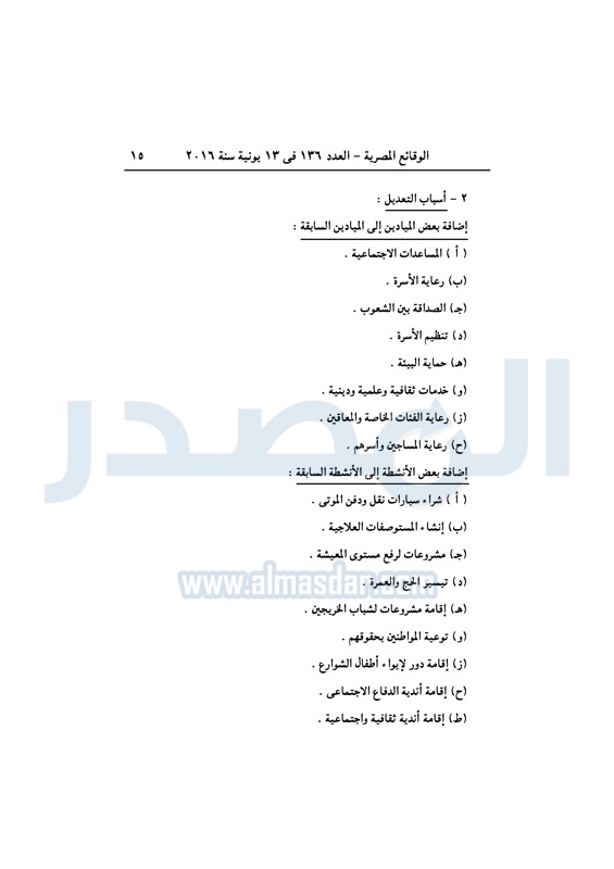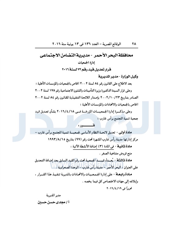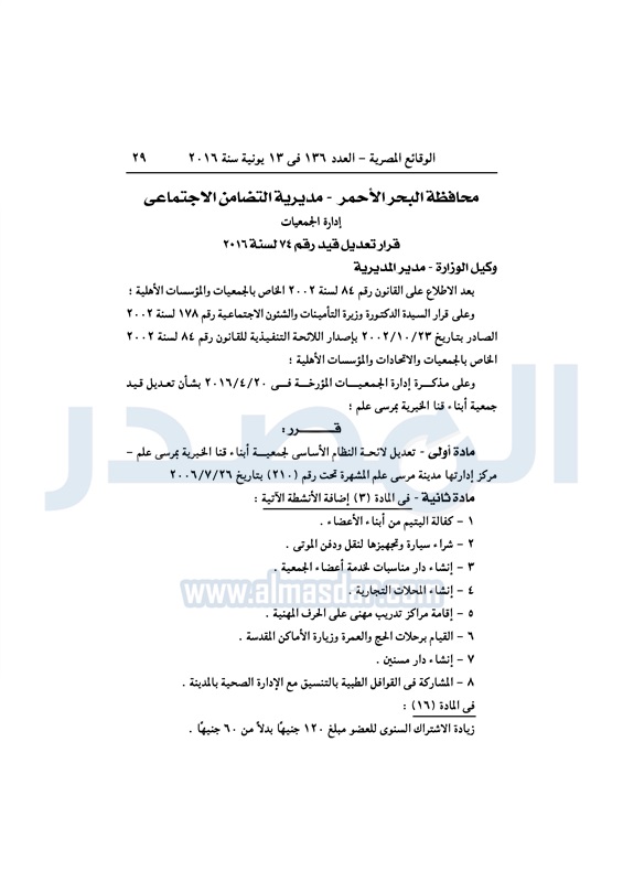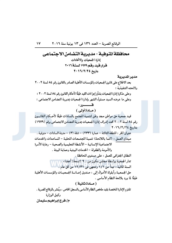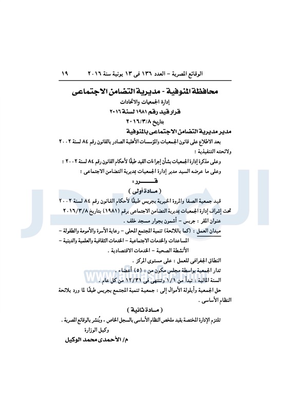 نشرت الوقائع المصرية، في العدد رقم 136، الصادر في 13 يونيو 2016، قرارات وزارة التضامن الاجتماعي، ومديريات التضامن في عدد من المحافظات، بشأن قيد وشهر عدد من الجمعيات.