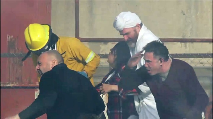 في الخارج اصيبت لقاء الخميسي بعد ما طرحت على الأرض جراء الانفجار، ولكنها تماسكت حتى وصلت لسطح المبنى وانهارت، انهالت لقاء بالضرب علي رامز وسبه بألفاظ خارجة بعدما كشف عن شخصيته.
