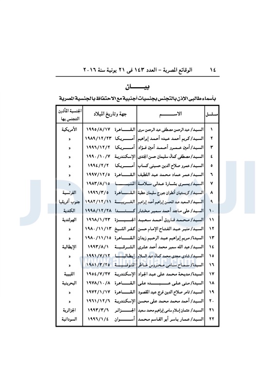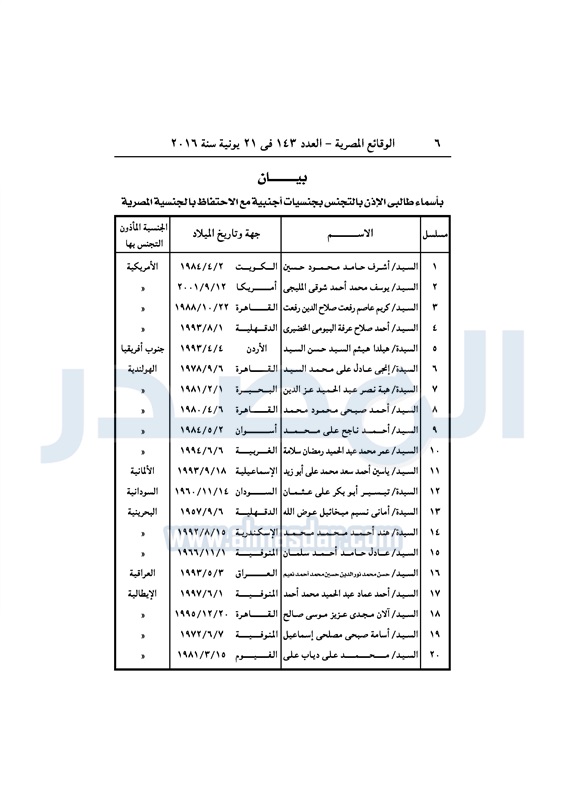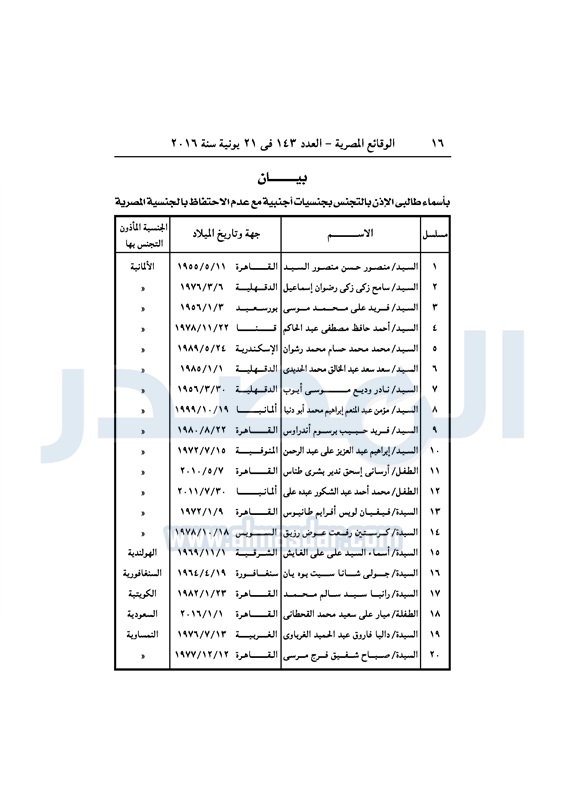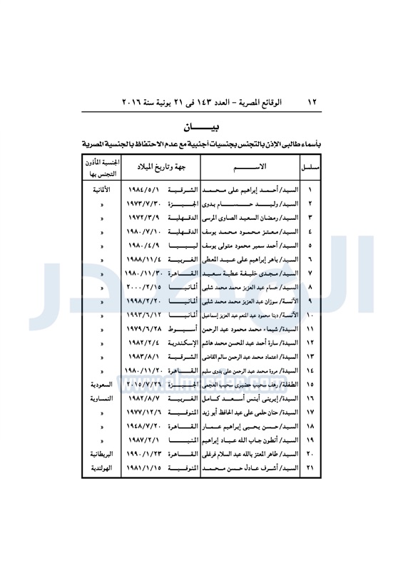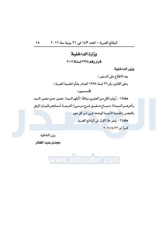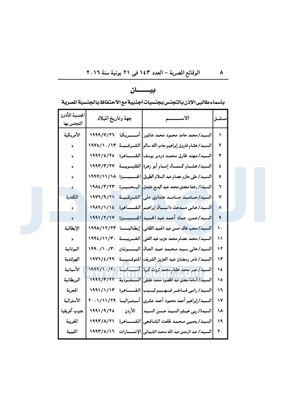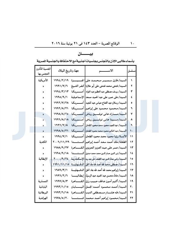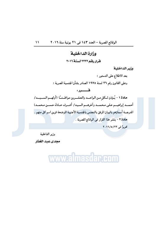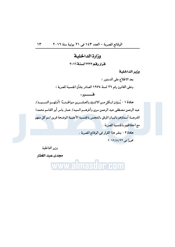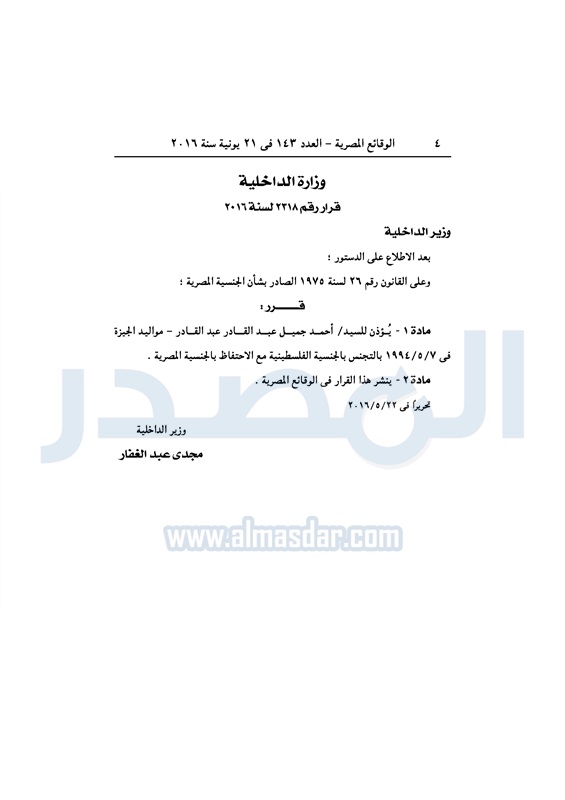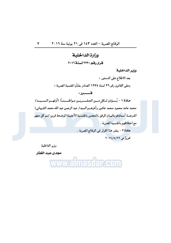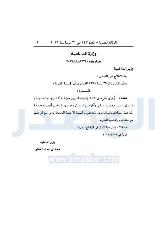 بالأسماء.. "الداخلية" توافق لـ105 مواطنين الحصول على جنسيات أجنبية الثلاثاء 21 يونيو 2016 - 10:05 ص 6/21/2016 10:05:00 AM وزارة الداخلية - صورة أرشيفية المصدر - خاص طباعة شارك نشرت الوقائع المصرية، في العدد رقم 143، الصادر في 21 يونيو 2016، قرارات وزارة الداخلية، بشأن الإذن لعدد من المواطنين بالتجنس بجنسيات أجنبية.لقراءة القرار: طباعة شارك جنسيات أجنبية الداخلية الجنسية المصرية التجنس تابع المصدر علي جوجل نيوز تطبيق نبض