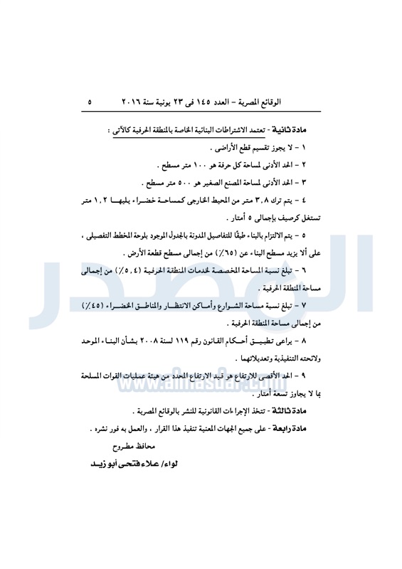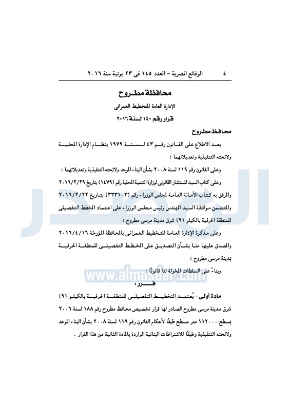 نشرت الوقائع المصرية، في العدد رقم 145، الصادر في 23 يونيو 2016، قرار محافظة مطروح، رقم 140 لسنة 2016، باعتماد المخطط التفصيلي للمنطقة الحرفية، بالكيلو 9، شرق مدينة مرسى مطروح.