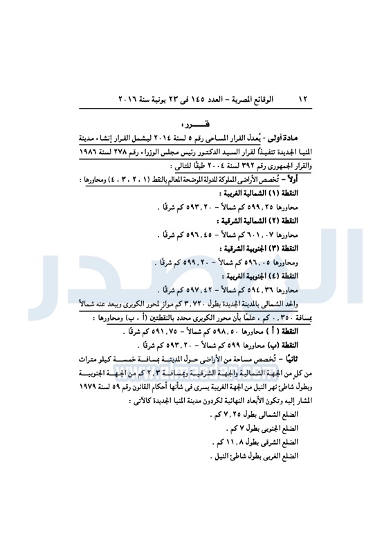 نشرت الوقائع المصرية، في العدد رقم 145، الصادر في 23 يونيو 2016، قرار الهيئة المصرية العامة للمساحة، رقم 3 لسنة 2016، تعديل القرار المساحي، رقم 5 لسنة 2014، ليشمل إنشاء مدينة المنيا الجديدة.