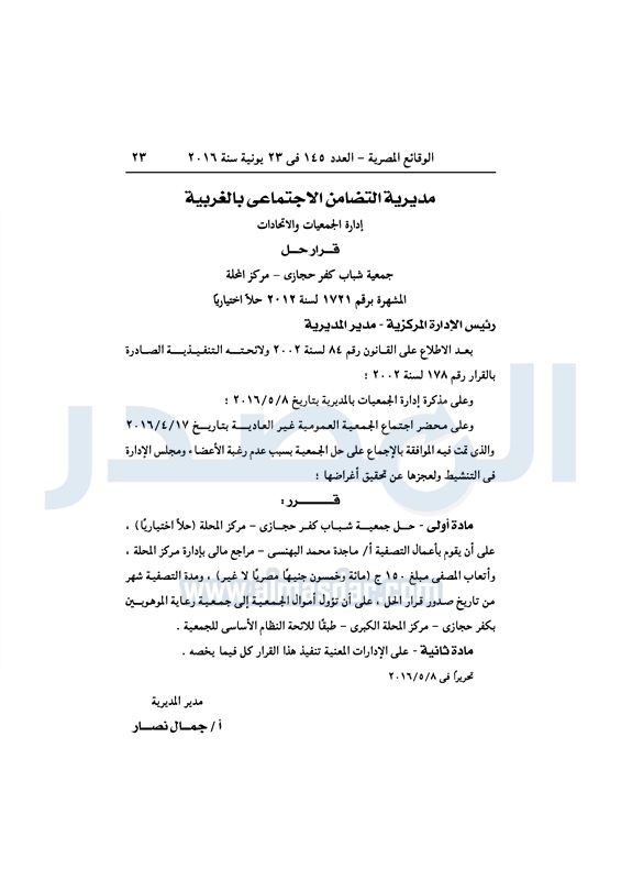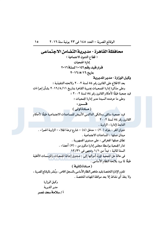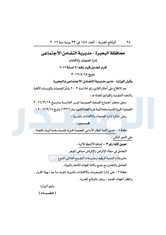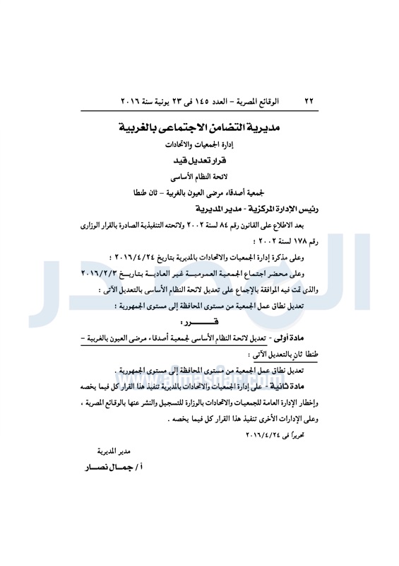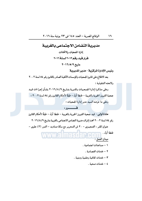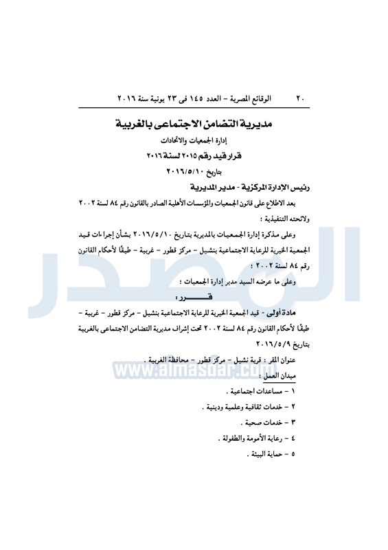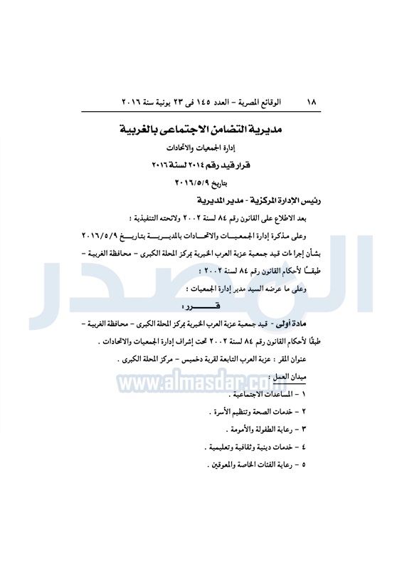 محافظات التضامن تقيد عددًا من الجمعيات في المحافظات الخميس 23 يونيو 2016 - 09:59 ص 6/23/2016 9:59:17 AM وزارة التضامن الاجتماعي - صورة أرشيفية المصدر - خاص طباعة شارك نشرت الوقائع المصرية، في العدد رقم 145، الصادر في 23 يونيو 2016، قرارات وزارة التضامن الاجتماعي، ومديريات التضامن في عدد من المحافظات، بشأن قيد وشهر عدد من الجمعيات.لقراءة القرار: طباعة شارك لائحة النظام الأساسي الوقائع المصرية المحافظات التضامن الاجتماعي تابع المصدر علي جوجل نيوز تطبيق نبض