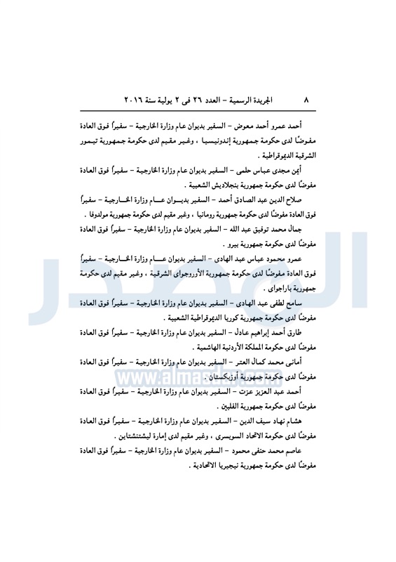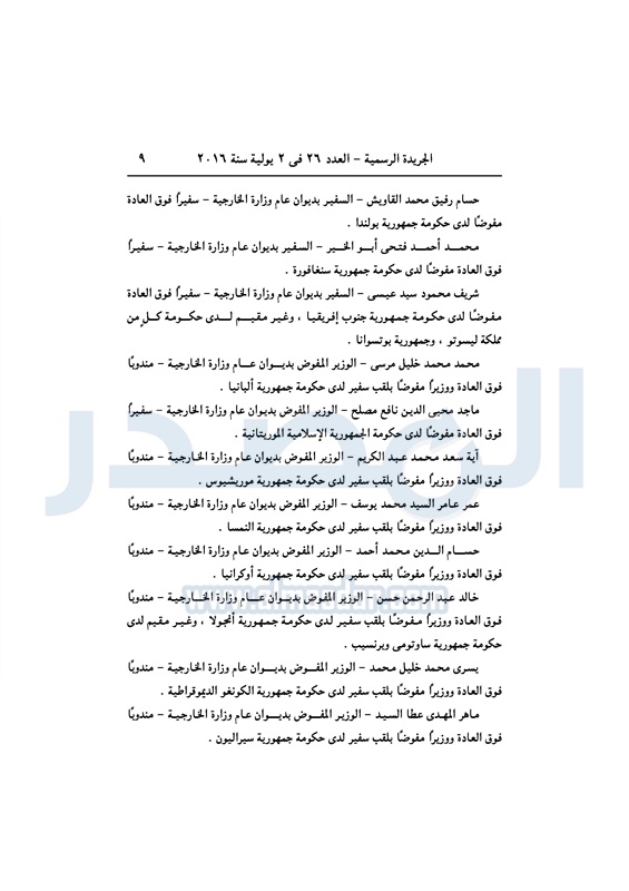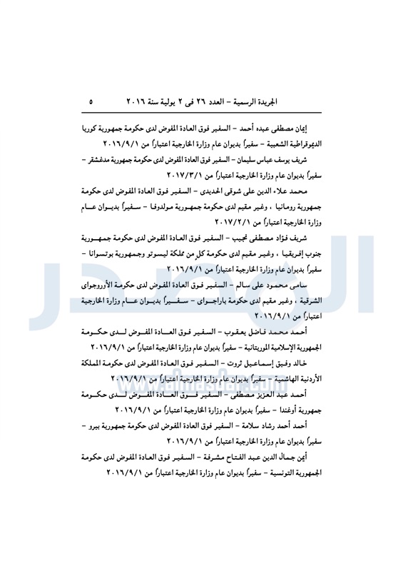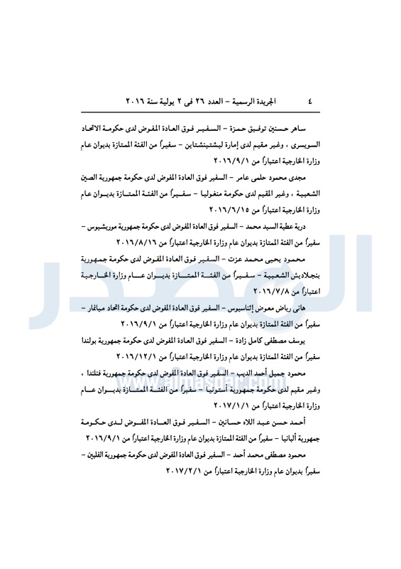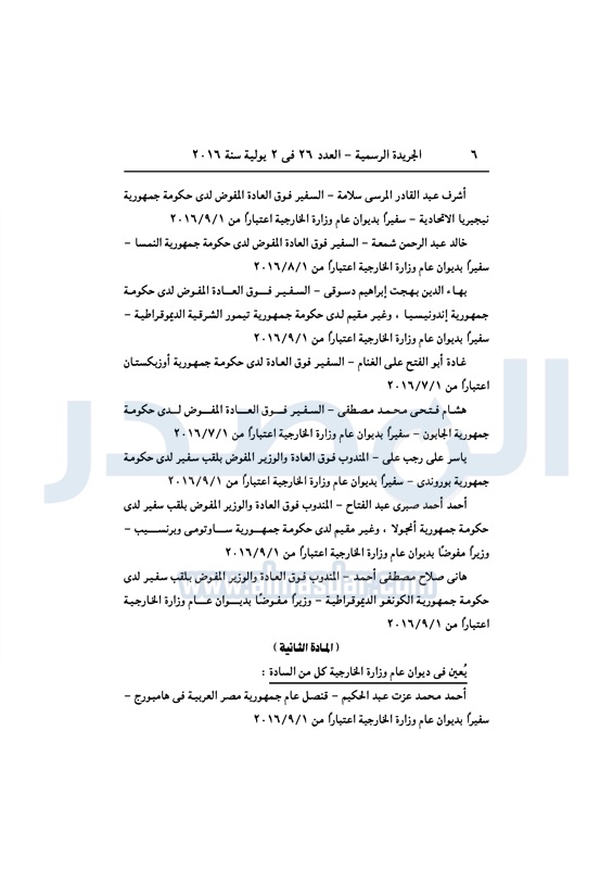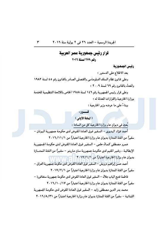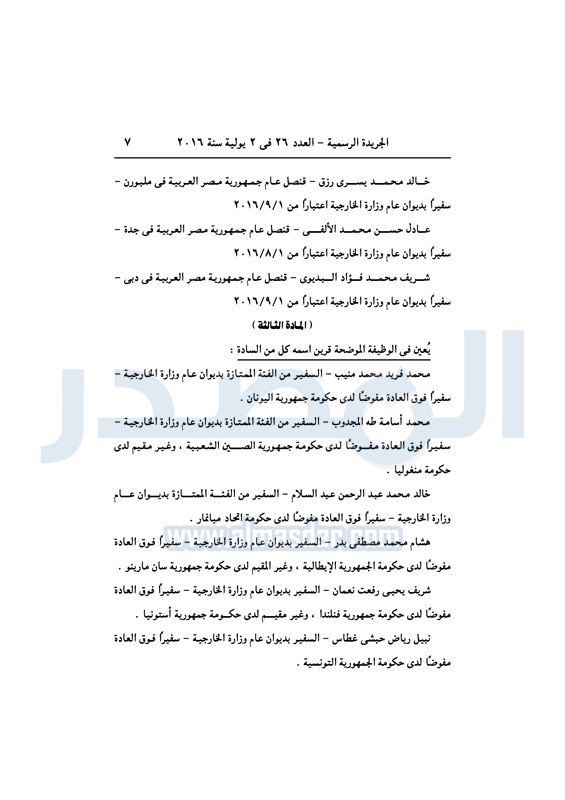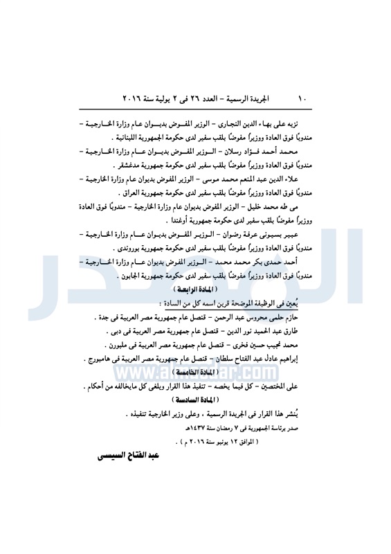 أخبار مصر السيسي يعين عددا من السفراء في ديوان عام "الخارجية" الأحد 03 يوليو 2016 - 10:39 ص 7/3/2016 10:39:00 AM عبد الفتاح السيسي رئيس الجمهورية المصدر - خاص طباعة شارك نشرت الجريدة الرسمية في العدد رقم 26 الصادر في 2 يوليو 2016، قرار رئيس عبد الفتاح السيسي، رقم 279 لسنة 2016، بتعيين بعض السفراء، في ديوان عام وزارة الخارجية. لقراءة القرار: طباعة شارك وزارة الخارجية عبد الفتاح السيسى سفراء ديوان عام الوزارة السيسى الخارجية الجريدة الرسمية أخبار مصر تابع المصدر علي جوجل نيوز تطبيق نبض