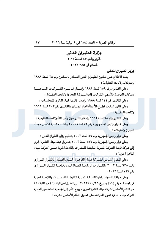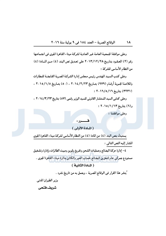 سياحة و طيران "الطيران" تعدل النظام الأساسي لشركة ميناء القاهرة الجوي الأحد 10 يوليو 2016 - 10:35 ص 7/10/2016 10:35:00 AM شريف فتحي وزير الطيران المدني المصدر - خاص طباعة شارك نشرت الوقائع المصرية، في العدد رقم 154، الصادر في 9 يوليو 2016، قرار وزارة الطيران المدني، رقم 551 لسنة 2016، بتعديل النظام الأساسي لشركة ميناء القاهرة الجوي. لقراءة القرار: طباعة شارك وزارة الطيران المدني ميناء القاهرة الجوي الوقائع المصرية النظام الاساسي تابع المصدر علي جوجل نيوز تطبيق نبض