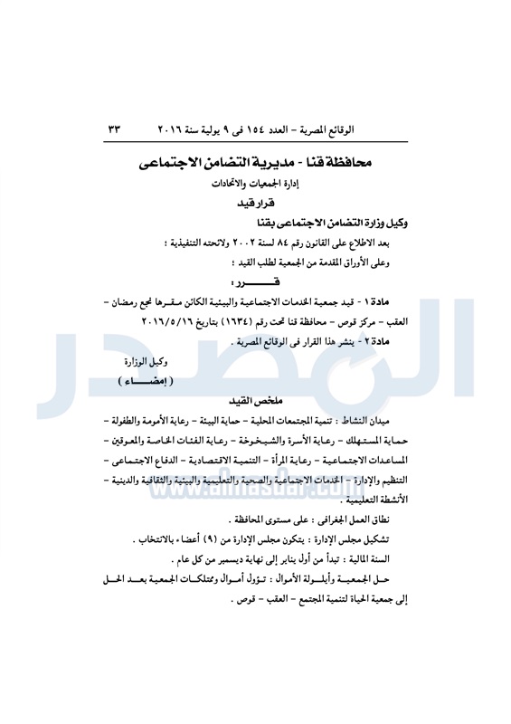 نشرت الوقائع المصرية، في العدد رقم 154، الصادر في 9 يوليو 2016، قرار محافظة أسيوط، رقم 489 لسنة 2016، قرارات وزارة التضامن الاجتماعي، ومديريات التضامن في عدد من المحافظات، بشأن قيد وشهر عدد من الجمعيات.