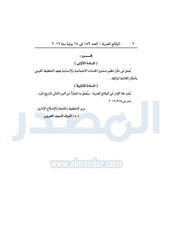 نشرت الوقائع المصرية، في العدد رقم 159، الصادر اليوم 14 يوليو 2016، قرار وزارة التخطيط والمتابعة والإصلاح الإداري، رقم 12 لسنة 2016، بإصدار اللائحة الداخلية لصندوق الخدمات الاجتماعية والإنسانية، بمعهد التخطيط القومي.