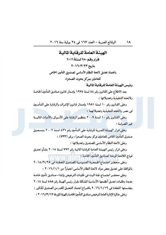 نشرت الوقائع المصرية، في العدد رقم 167، الصادر اليوم 25 يوليو 2016، قرار الهيئة العامة للرقابة المالية، رقم 280 لسنة 2016، باعتماد تعديل لائحة النظام الأساسي لصندوق التأمين الخاص، للعاملين بمركز بحوث الصحراء.