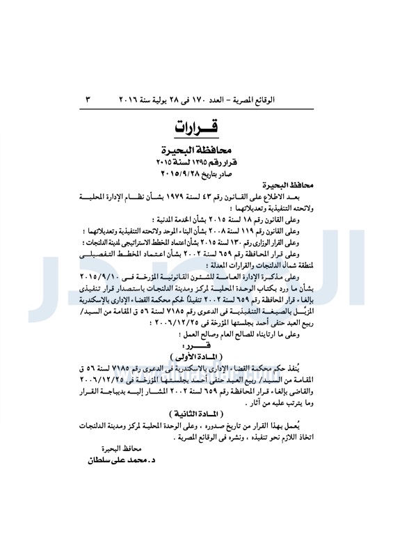 نشرت الوقائع المصرية، في العدد رقم 170، الصادر اليوم 28 يوليو 2016، قرار محافظة البحيرة، رقم 1395 لسنة 20115، بإلغاء اعتماد المخطط التفصيلي لمنطقة شمال الدلنجات، وذلك تنفيذًا لحكم محكمة القضاء الإداري بالإسكندرية، في الدعوى رقم 7185 لسنة 56 ق.