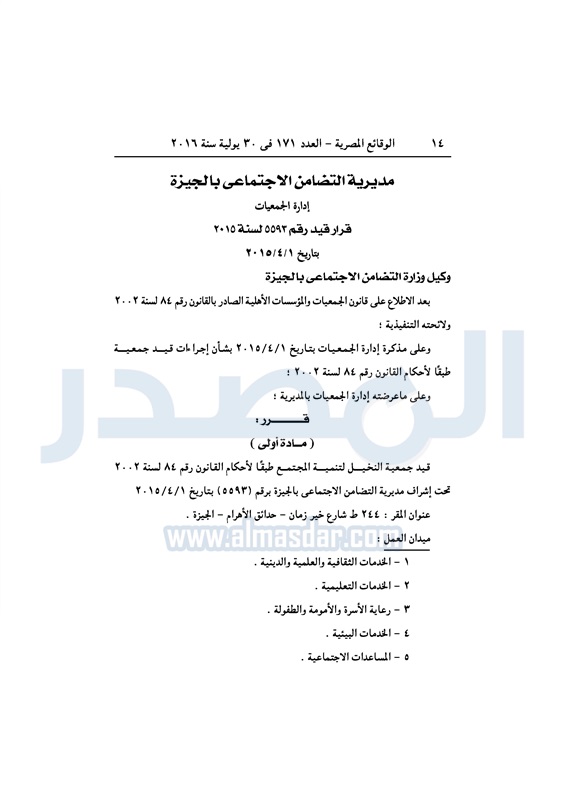 محافظات "التضامن" بالجيزة تقيد جمعية النخيل لتنمية المجتمع الأحد 31 يوليو 2016 - 10:16 ص 7/31/2016 10:16:00 AM التضامن الاجتماعي - صورة أرشيفية المصدر - خاص طباعة شارك نشرت الوقائع المصرية، في العدد رقم 171، الصادر في 30 يوليو 2016، قرار مديرية التضامن الاجتماعي، بالجيزة، رقم 5593 لسنة 2015، بقيد جمعية النخيل لتنمية المجتمع. لقراءة القرار: طباعة شارك الوقائع المصرية النخيل الجيزة التضامن الاجتماعي تابع المصدر علي جوجل نيوز تطبيق نبض
