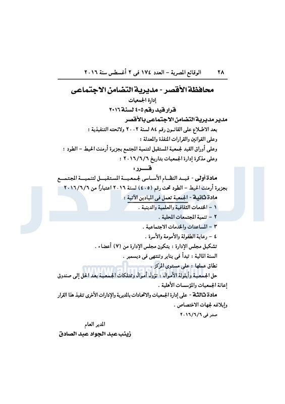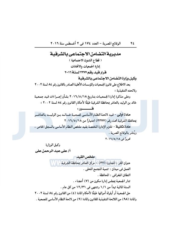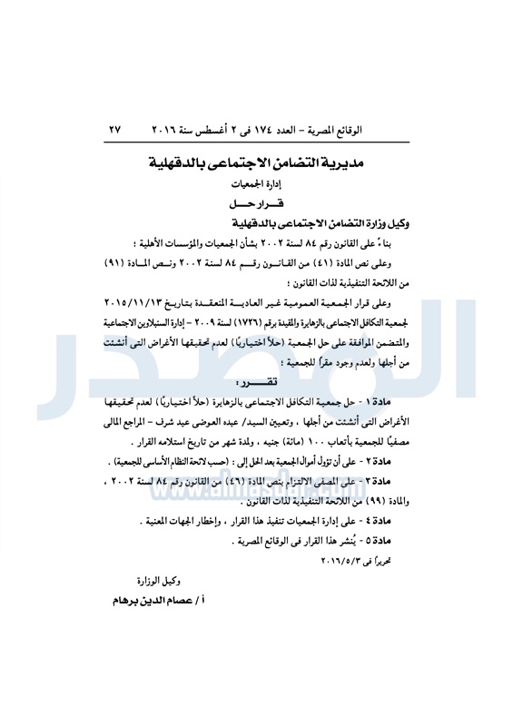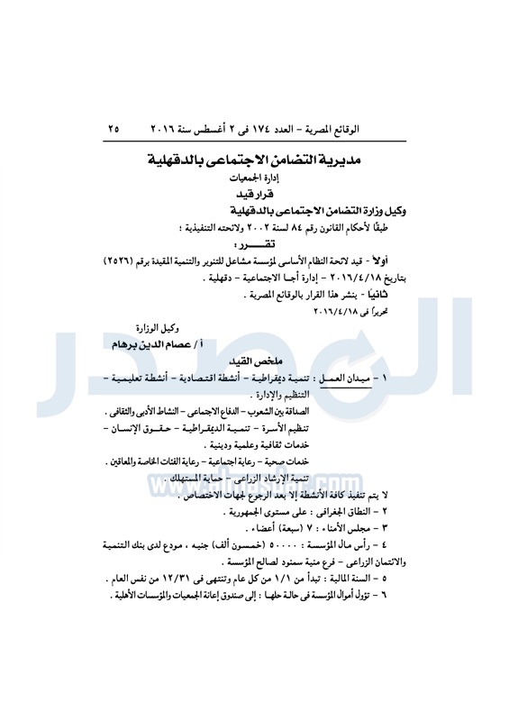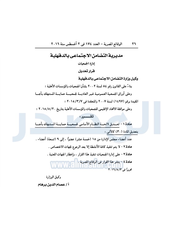 محافظات "التضامن" تقيد عددًا من الجمعيات في المحافظات الثلاثاء 02 أغسطس 2016 - 11:13 ص 8/2/2016 11:13:00 AM التضامن الاجتماعي - صورة أرشيفية المصدر - خاص طباعة شارك نشرت الوقائع المصرية، في العدد رقم 174، الصادر اليوم 2 أغسطس 2016، قرارات وزارة التضامن الاجتماعي، ومديريات التضامن في عدد من المحافظات، بشأن قيد وشهر وحل عدد من الجمعيات.لقراءة القرار: طباعة شارك لائحة النظام الأساسي قرار قيد الوقائع المصرية الشرقية الدقهلية التضامن الاجتماعي تابع المصدر علي جوجل نيوز تطبيق نبض