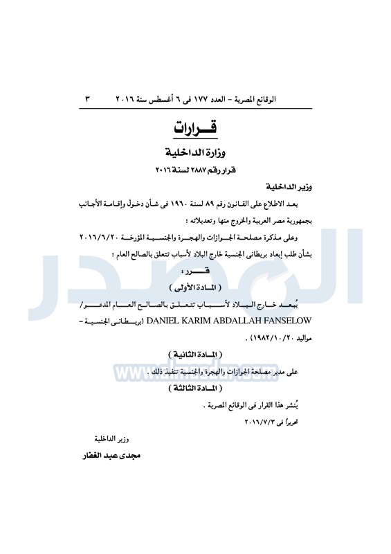 أخبار مصر إبعاد بريطاني خارج البلاد لأسباب تتعلق بالصالح العام الأحد 07 أغسطس 2016 - 11:49 ص 8/7/2016 11:49:00 AM وزارة الداخلية - صورة أرشيفية المصدر - خاص طباعة شارك نشرت الوقائع المصرية، في العدد رقم 177، الصادر في 6 أغسطس 2016، قرار وزارة الداخلية، رقم 2887 لسنة 2016، إبعاد بريطاني الجنسية، خارج البلاد لأسباب تتعلق بالصالح العام.لقراءة القرار: طباعة شارك وزارة الداخلية بريطانيا الوقائع المصرية الصالح العام تابع المصدر علي جوجل نيوز تطبيق نبض