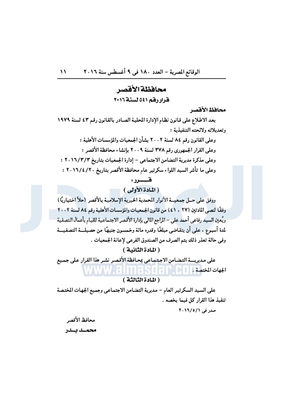 محافظات محافظة الأقصر تحل جمعية الأنوار المحمدية الثلاثاء 09 أغسطس 2016 - 11:26 ص 8/9/2016 11:26:00 AM محافظة الأقصر - صورة أرشيفية المصدر - خاص طباعة شارك نشرت الوقائع المصرية، في العدد رقم 180، الصادر في 9 أغسطس 2016، قرار محافظة الأقصر، رقم 541 لسنة 2016، بالموافقة على حل جمعية الأنوار المحمدية الخيرية الإسلامية، اختياريًالقراءة القرار: طباعة شارك محافظة الأقصر قرار حل الوقائع المصرية المحافظات الانوار المحمدية اخبار اليوم تابع المصدر علي جوجل نيوز تطبيق نبض