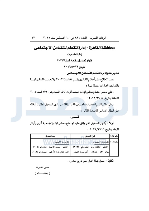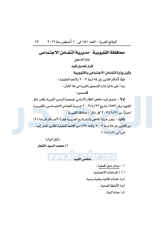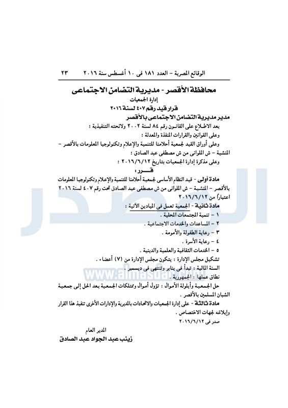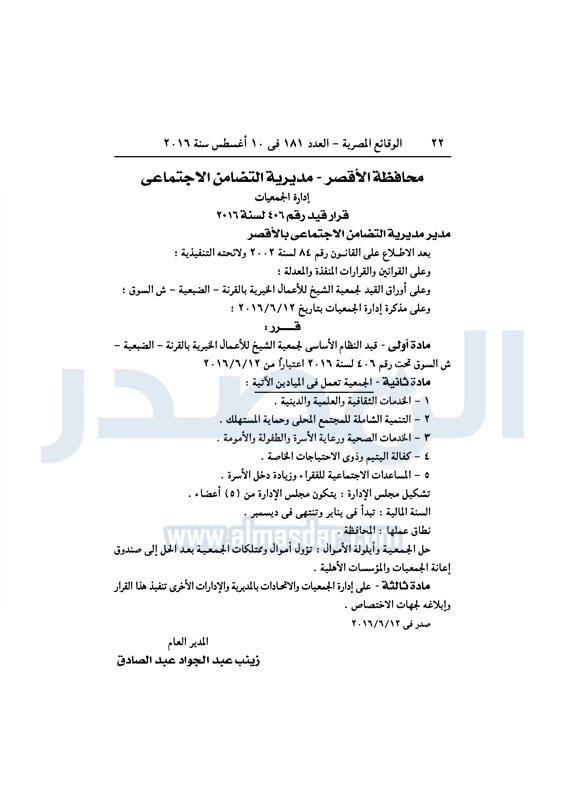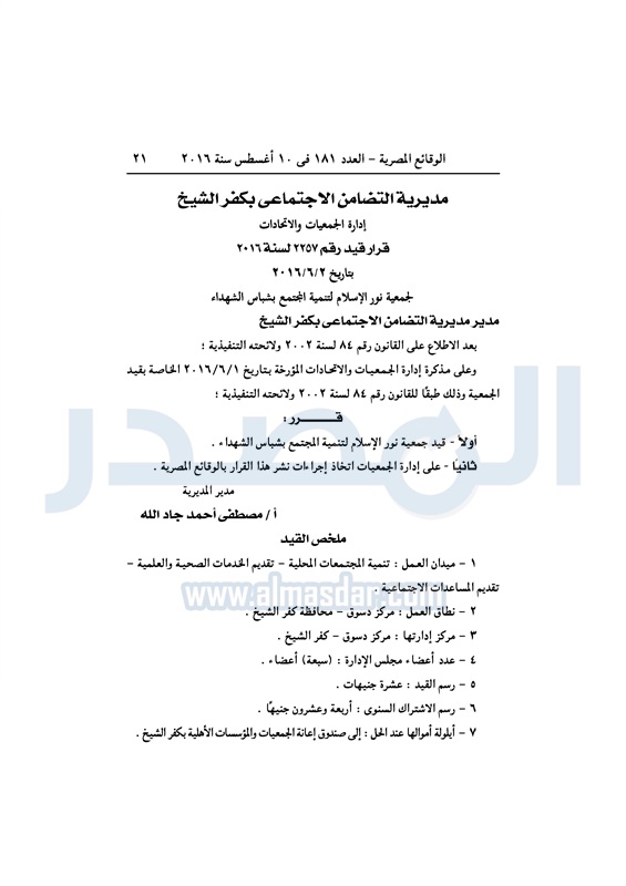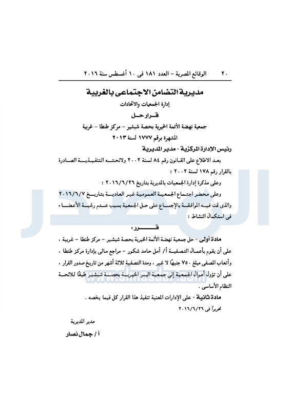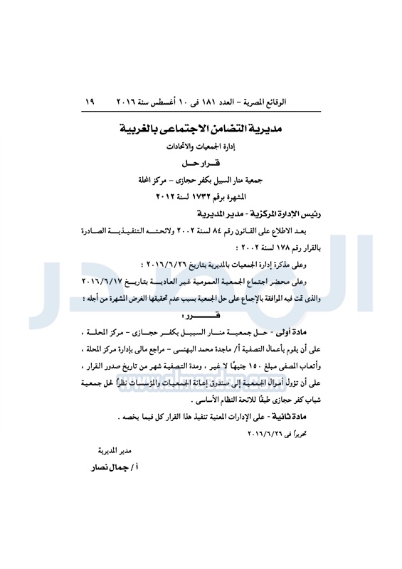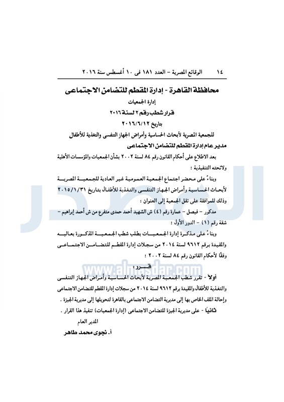 محافظات "التضامن" تقيد عددًا من الجمعيات في المحافظات الأربعاء 10 أغسطس 2016 - 10:29 ص 8/10/2016 10:29:45 AM التضامن الاجتماعي - صورة أرشيفية المصدر - خاص طباعة شارك نشرت الوقائع المصرية، في العدد رقم 181، الصادر في 10 أغسطس 2016، قرارات وزارة التضامن الاجتماعي، ومديريات التضامن في عدد من المحافظات، بشأن قيد وشهر وحل عددا من الجمعيات.لقراءة القرار: طباعة شارك جمعيات الوقائع المصرية النظام الاساسي التضامن الاجتماعي تابع المصدر علي جوجل نيوز تطبيق نبض