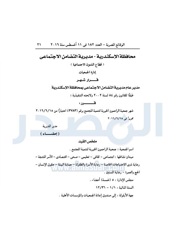 محافظات "التضامن" تقيد عددًا من الجمعيات في المحافظات الخميس 11 أغسطس 2016 - 02:18 م 8/11/2016 2:18:00 PM التضامن الاجتماعي - أرشيفية المصدر - خاص طباعة شارك نشرت الوقائع المصرية، في العدد رقم 182 لسنة 2016، قرارات وزارة التضامن الاجتماعي، ومديريات التضامن في عدد من المحافظات، بشأن قيد وشهر وحل عدد من الجمعيات.لقراءة القرار: طباعة شارك لائحة النظام الأساسي جمعيات الرقابه المالية التضامن الاجتماعي اخبار اليوم تابع المصدر علي جوجل نيوز تطبيق نبض