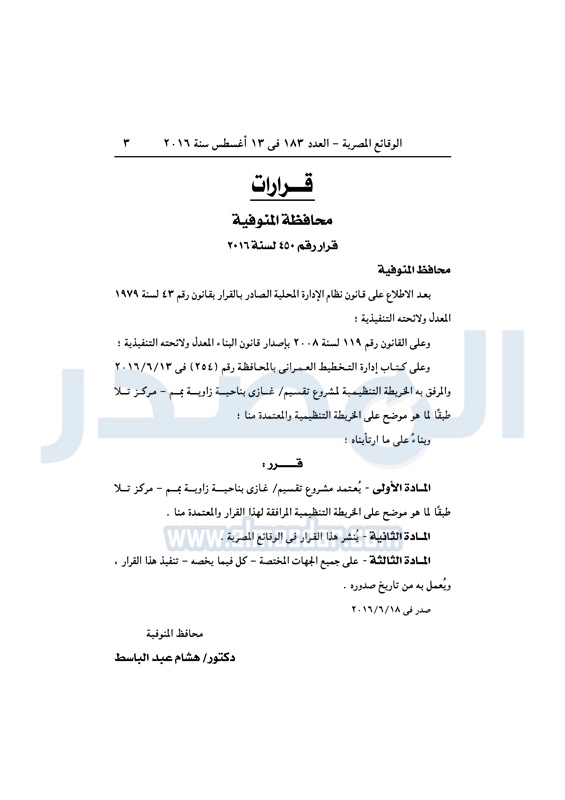 محافظات "المنوفية" تعتمد تقسيم غازي بمركز تلا الأحد 14 أغسطس 2016 - 10:16 ص 8/14/2016 10:16:00 AM هشام عبد الباسط محافظ المنوفية المصدر - خاص طباعة شارك نشرت الوقائع المصرية، في العدد رقم 183، الصادر في 13 أغسطس 2016، قرار محافظة المنوفية، رقم 450 لسنة 2016، باعتماد مشروع تقسيم غازي، بناحية زاوية بمم - مركز تلا. لقراءة القرار: طباعة شارك مشروع تقسيم مركز تلا محافظة المنوفية زاوية بمم الوقائع المصرية تابع المصدر علي جوجل نيوز تطبيق نبض