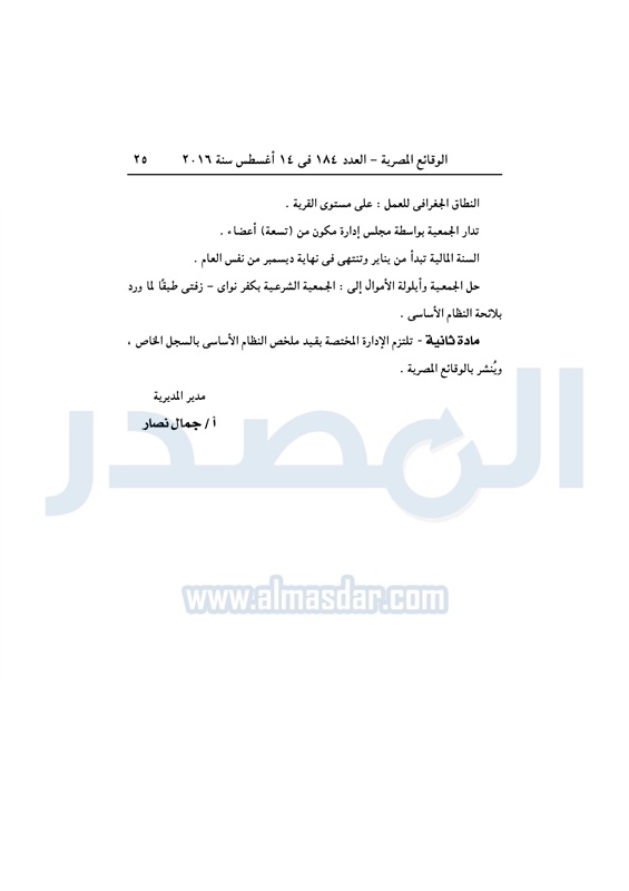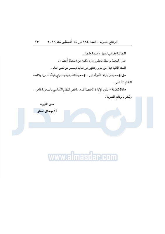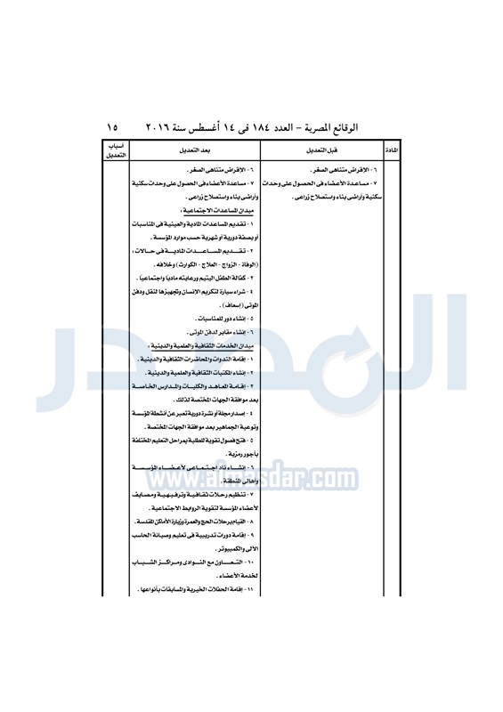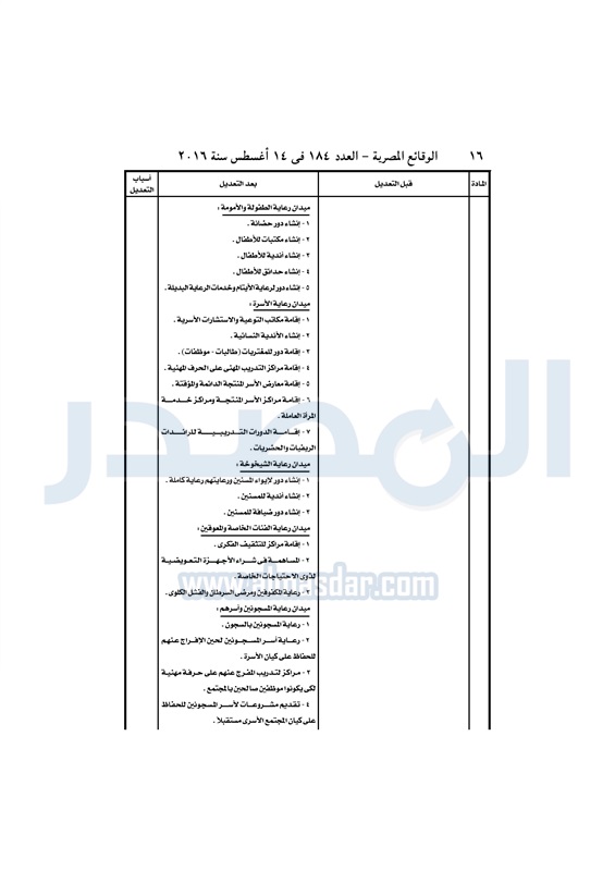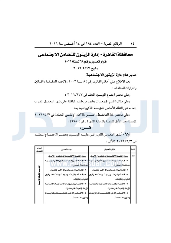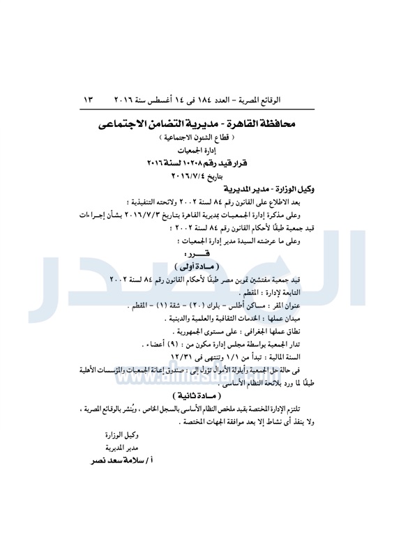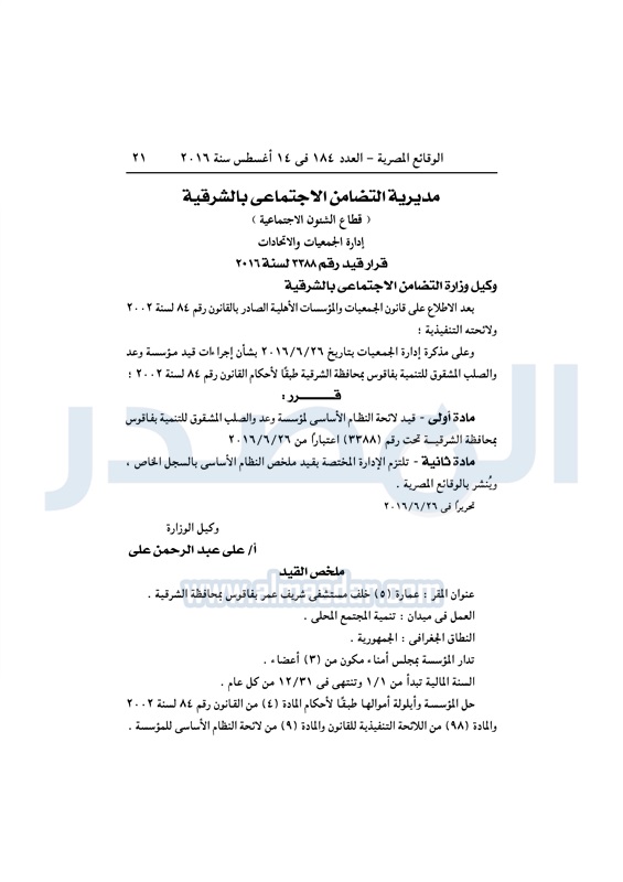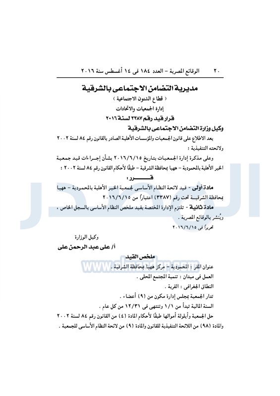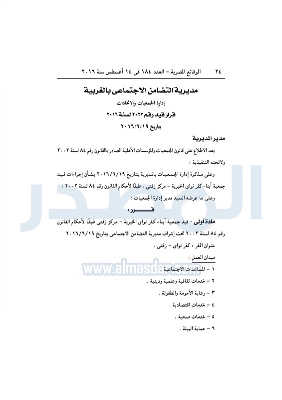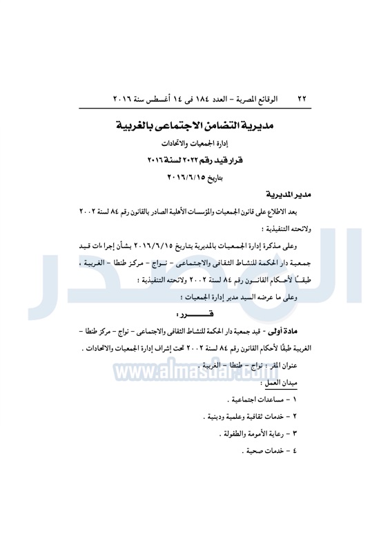 نشرت الوقائع المصرية، في العدد رقم 184، الصادر في 14 أغسطس 2016، قرارات وزارة التضامن الاجتماعي، ومديريات التضامن في عدد من المحافظات، بشأن قيد وشهر وحل عدد من الجمعيات.