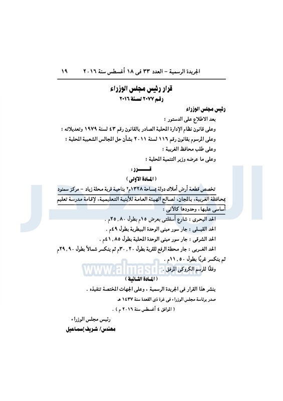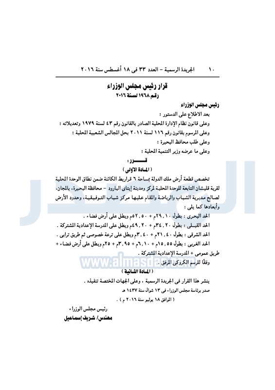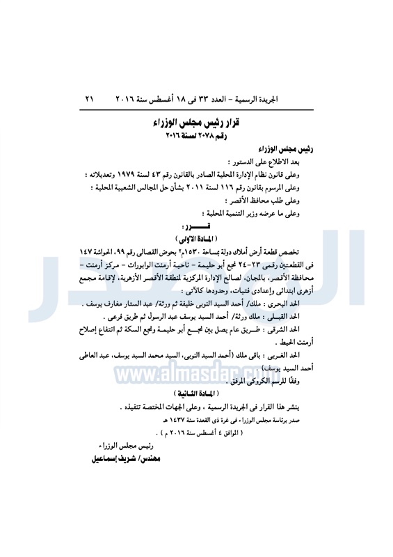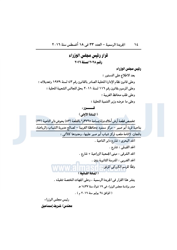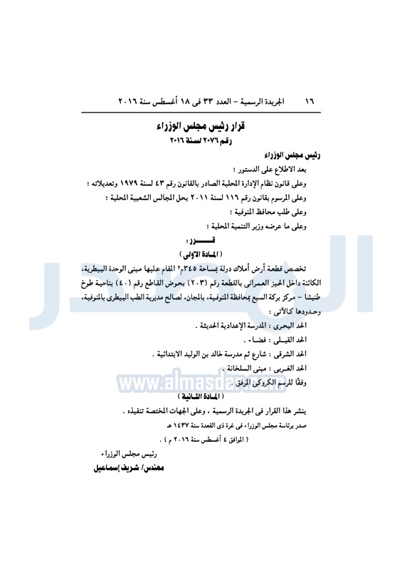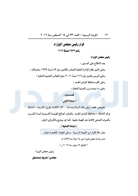 عقارات رئيس الوزراء يخصص قطع أراضي لعدد من الجهات الخميس 18 أغسطس 2016 - 10:17 ص 8/18/2016 10:17:00 AM شريف إسماعيل رئيس مجلس الوزراء المصدر - خاص طباعة شارك نشرت الجريدة الرسمية، في العدد رقم 33، الصادر في 18 أغسطس 2016، قرارات رئيس مجلس الوزراء، بتخصيص قطع أراضي، لعدد من الجهات المختلفة.لقراءة القرار: طباعة شارك شريف اسماعيل رئيس الوزراء تخصيص أراضي الجريدة الرسمية تابع المصدر علي جوجل نيوز تطبيق نبض