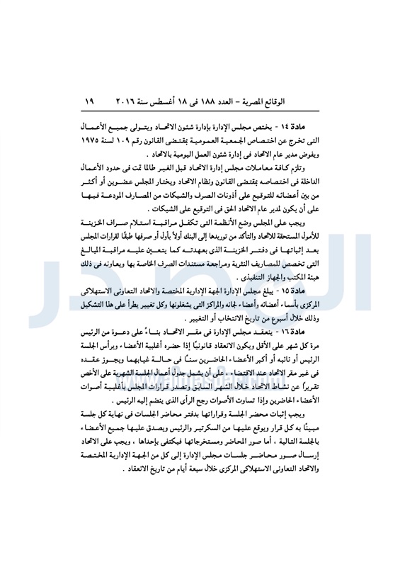 نشرت الوقائع المصرية، في العدد رقم 188، الصادر في 18 أغسطس 2016، لائحة النظام الداخلي، للاتحاد التعاوني الاستهلاكي، لمحافظة الإسكندرية، المعدلة بناءً على قرار الجمعية العمومية الاستثنائية.