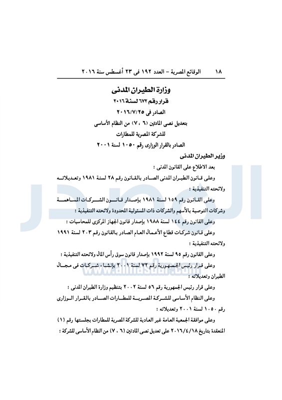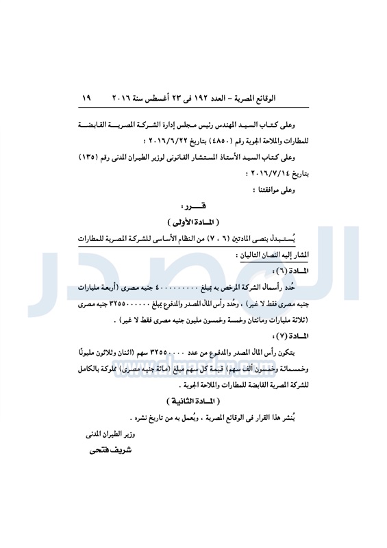 سياحة و طيران شريف فتحي يعدل النظام الأساسي لـ "المصرية للمطارات" الثلاثاء 23 أغسطس 2016 - 11:01 ص 8/23/2016 11:01:00 AM شريف فتحي وزير الطيران المصدر - خاص طباعة شارك نشرت الوقائع المصرية، في العدد رقم 192، الصادر في 23 أغسطس 2016، قرار وزارة الطيران المدني، رقم 672 لسنة 2016، بتعديل النظام الأساسي، للشركة المصرية للمطارات.لقراءة القرار: طباعة شارك وزارة الطيران لائحة النظام الأساسي الوقائع المصرية الشركة المصرية للمطارات تابع المصدر علي جوجل نيوز تطبيق نبض