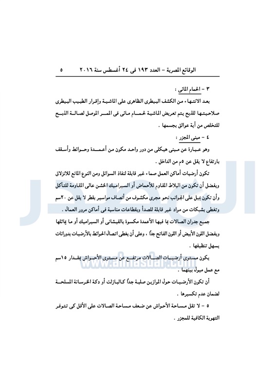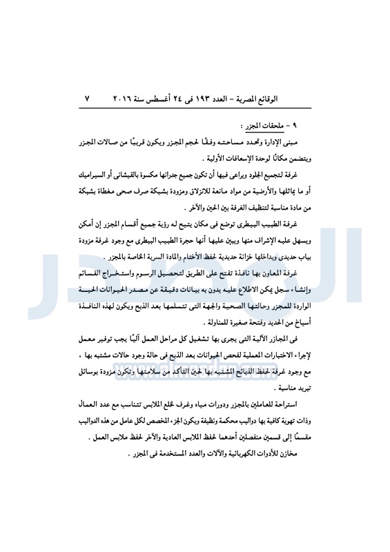 نشرت الوقائع المصرية، في العدد رقم 193، الصادر في 24 أغسطس 2016، قراري وزارة الإسكان والمرافق والمجتمعات العمرانية، رقما 498، و499 لسنة 2016، بالاشتراطات العامة الواجب توافرها، في مجازر المواشي والأغنام والجمال والخنازير، ومجازر الدواجن
