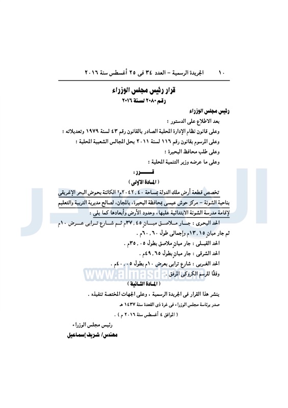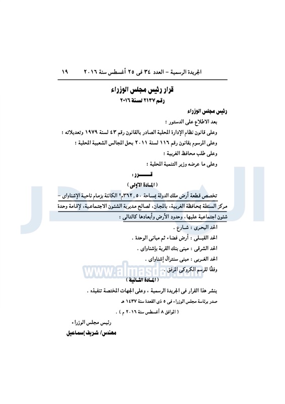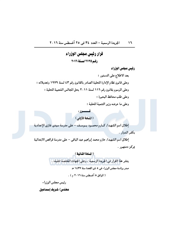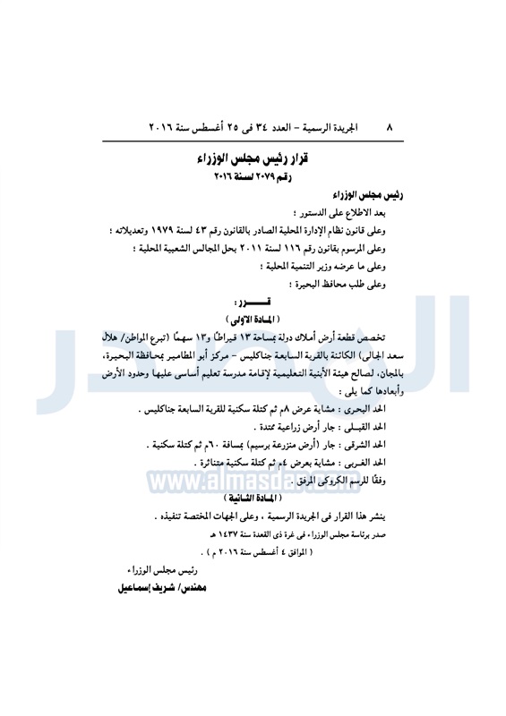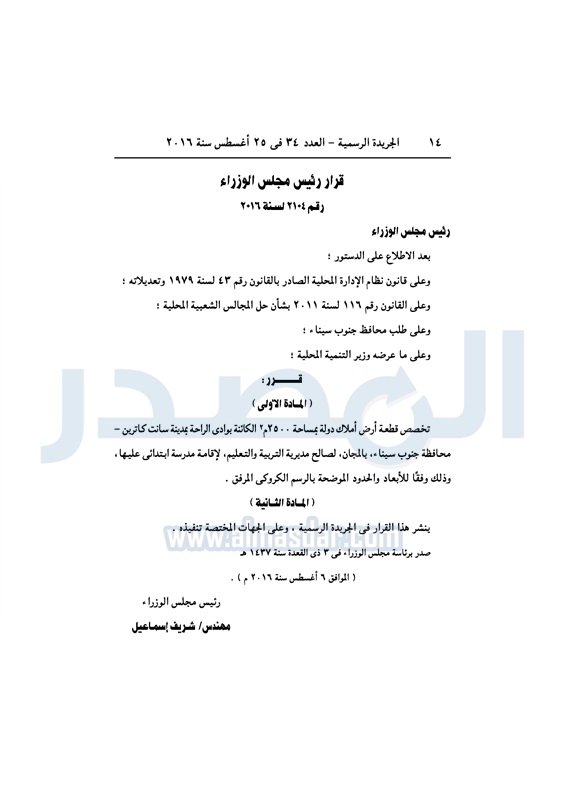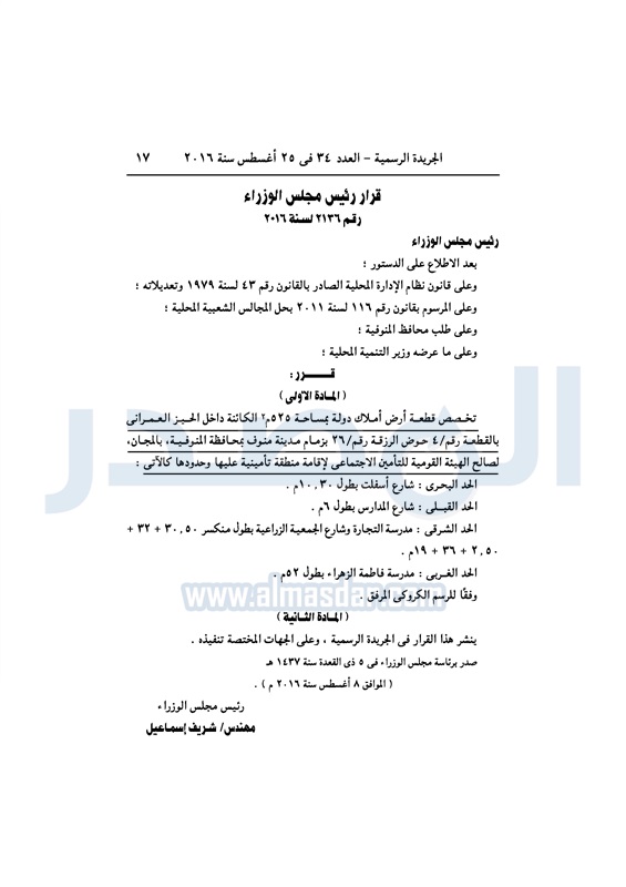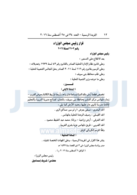 عقارات الحكومة تخصص قطع أراضي لعدد من الجهات الخميس 25 أغسطس 2016 - 11:08 ص 8/25/2016 11:08:00 AM شريف إسماعيل رئيس مجلس الوزراء المصدر - خاص طباعة شارك نشرت الجريدة الرسمية، في العدد رقم 34، الصادر في 25 أغسطس 2016، قرارات رئيس مجلس الوزراء، بتخصيص قطع أراضي، لعدد من الجهات المختلفة.لقراءة القرار: طباعة شارك قطع اراضي شريف اسماعيل رئيس الوزراء العقارات الجريدة الرسمية تابع المصدر علي جوجل نيوز تطبيق نبض