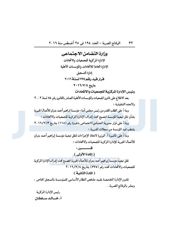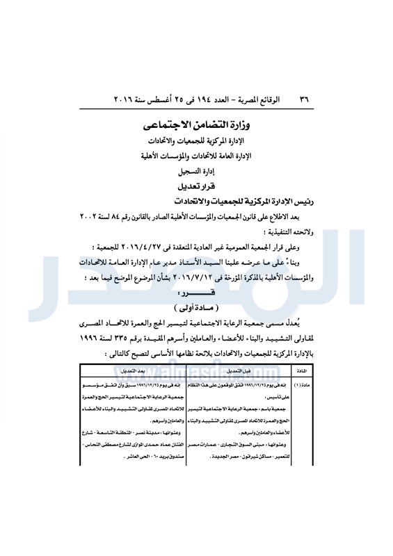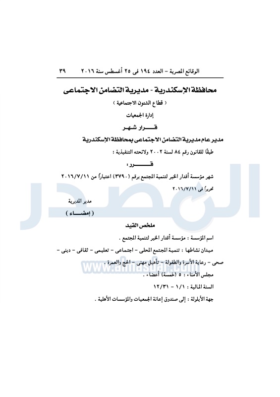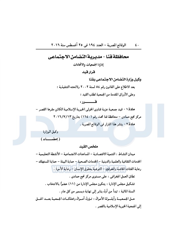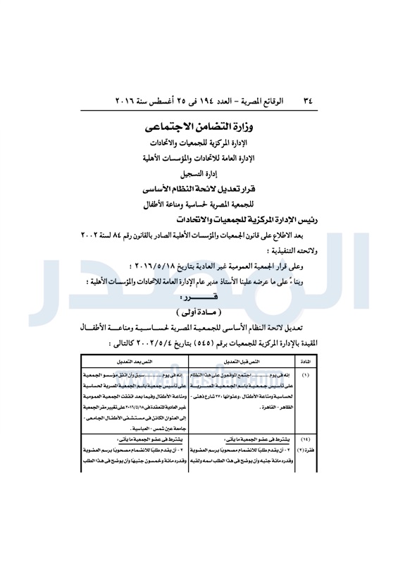 محافظات "التضامن" تقيد عددًا من الجمعيات في المحافظات الخميس 25 أغسطس 2016 - 11:41 ص 8/25/2016 11:41:00 AM التضامن الاجتماعي - أرشيفية المصدر - خاص طباعة شارك نشرت الوقائع المصرية، في العدد رقم 194، الصادر في 25 أغسطس 2016، قرارات وزارة التضامن الاجتماعي، ومديريات التضامن في عدد من المحافظات، بشأن قيد وشهر وحل عدد من الجمعيات.لقراءة القرار: طباعة شارك لائحة النظام الأساسي قرار قيد جمعيات الوقائع المصرية التضامن الاجتماعي تابع المصدر علي جوجل نيوز تطبيق نبض