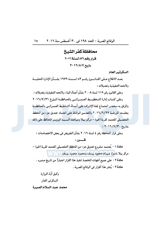 محافظات "كفرالشيخ" تعدل المخطط التفصيلي لقرية الحوة الثلاثاء 30 أغسطس 2016 - 12:19 م 8/30/2016 12:19:00 PM كفر الشيخ - أرشيفية المصدر - خاص طباعة شارك نشرت الوقائع المصرية، في العدد رقم 198، الصادر في 30 أغسطس 2016، قرار محافظة كفر الشيخ، رقم 876 لسنة 2016، باعتماد مشروع تعديل جزء المخطط التفصيلي، لقرية الحوة - مركز بيلا.لقراءة القرار: طباعة شارك كفر الشيخ الوقائع المصرية المخطط التفصيلي الحوة تابع المصدر علي جوجل نيوز تطبيق نبض