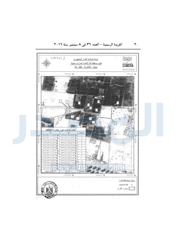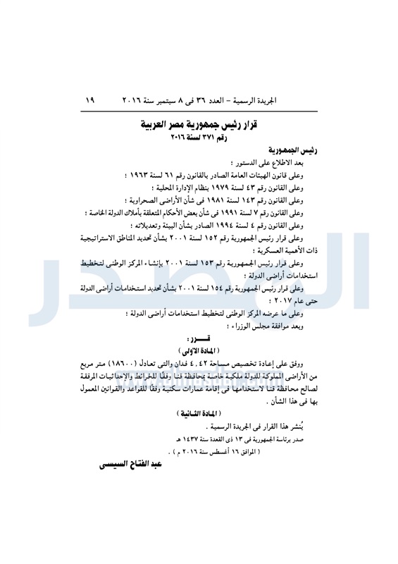 نشرت الجريدة الرسمية في العدد رقم 36 الصادر في 8 سبتمبر 2016، قرار رئيس الجمهورية رقم 371 لسنة 2016، بشأن تخصيص قطعة أرض لصالح محافظة قنا لاستخدامها في إقامة عمارارت سكنية.