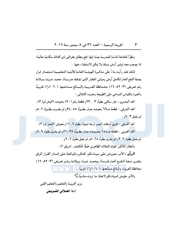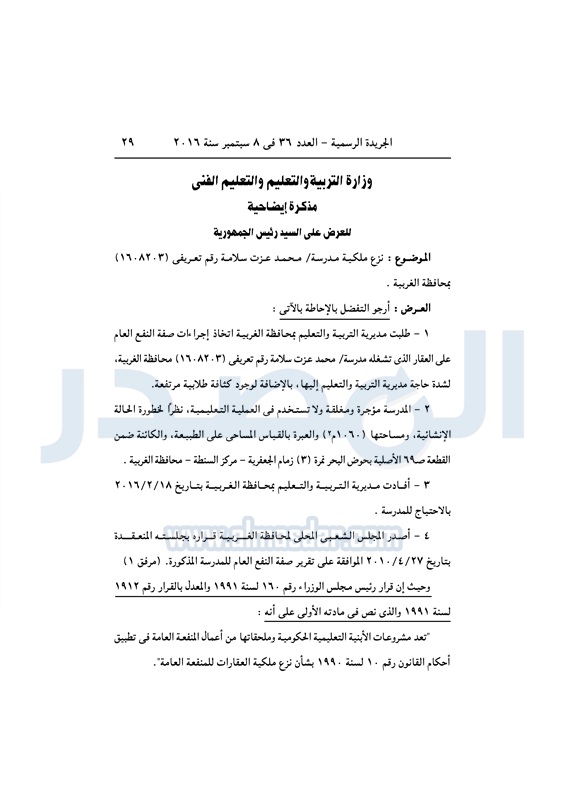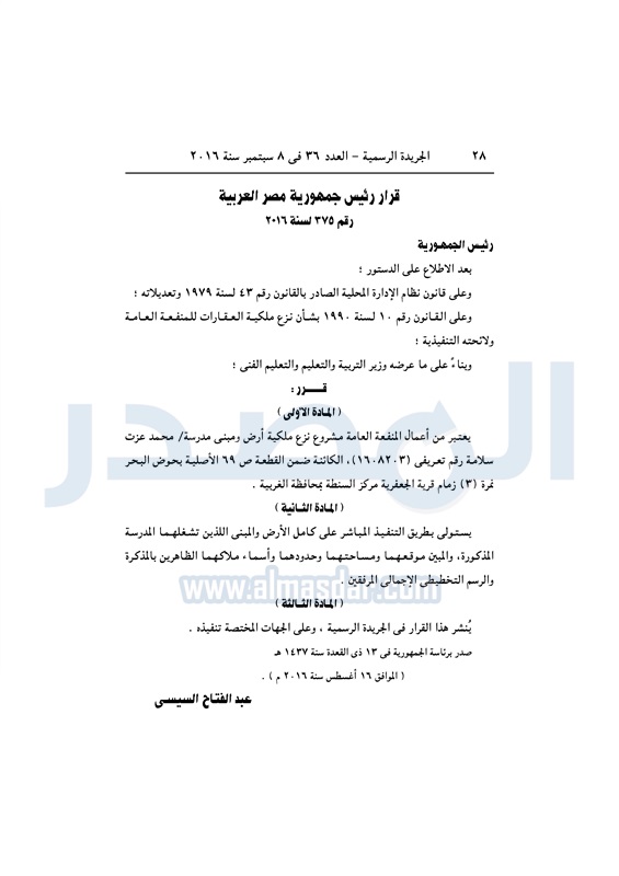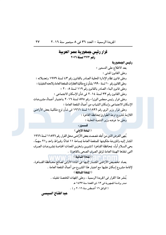 عقارات السيسي يعيد تخصيص عددا من الأراضي بالقاهرة لإقامة مشاريع إسكان الخميس 08 سبتمبر 2016 - 10:43 ص 9/8/2016 10:43:00 AM عبد الفتاح السيسي رئيس الجمهورية المصدر - خاص طباعة شارك نشرت الجريدة الرسمية في العدد رقم 36 الصادر في 8 سبتمبر 2016، قرار رئيس الجمهورية رقم 373 لسنة 2016، بشأن إعادة تخصيص عدد من الأراضي لإقامة مشروع إسكان عليها.لقراءة القرار: طباعة شارك السيسى الجريدة الرسمية الإسكان أراضى الدولة تابع المصدر علي جوجل نيوز تطبيق نبض