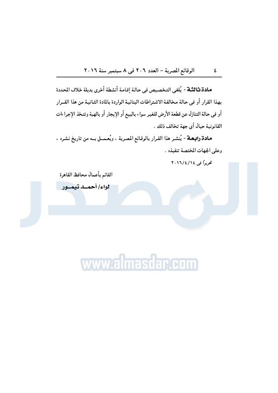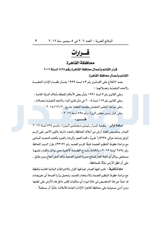 محافظات محافظ القاهرة يخصص قطعة أرض لصالح مديرية الشئون الصحية الخميس 08 سبتمبر 2016 - 11:28 ص 9/8/2016 11:28:00 AM أحمد تيمور- القائم بأعمال محافظ القاهره المصدر - خاص طباعة شارك نشرت الوقائع المصرية في العدد رقم 206 الصادر في 8 سبتمبر 2016، قرار محافظة القاهرة، رقم 4438 لسنة 2016، بشأن تخصيص قطعة أرض لصالح مديرية الشئون الصحية دون مقابل.لقراءة القرار: طباعة شارك محافظة القاهرة قطعة أرض الوقائع المصرية اللواء أحمد تيمور الصحة أملاك الدولة تابع المصدر علي جوجل نيوز تطبيق نبض
