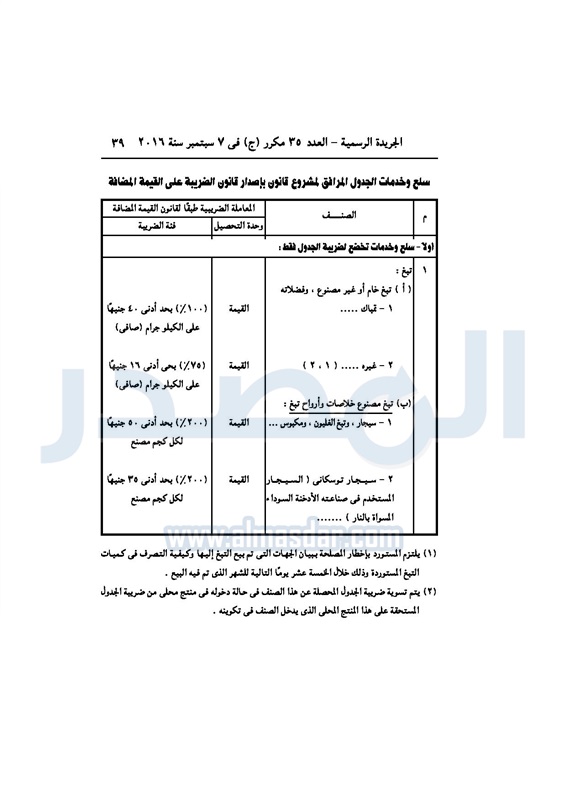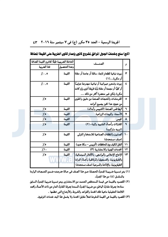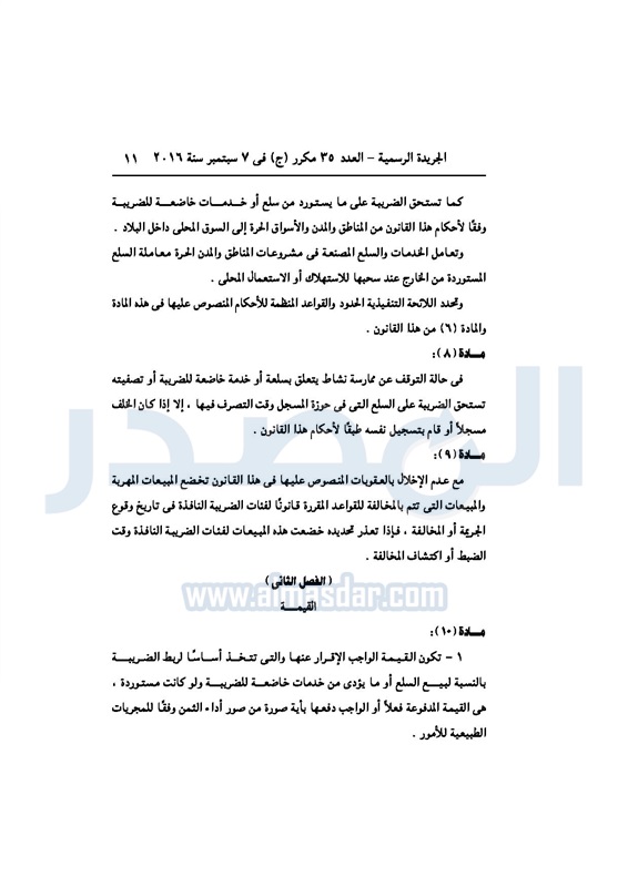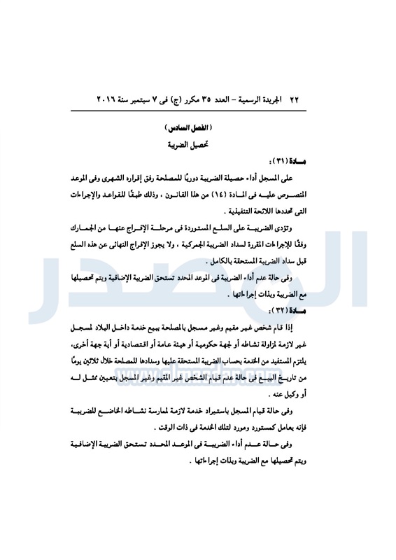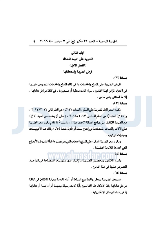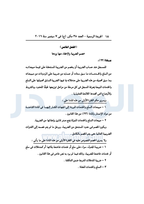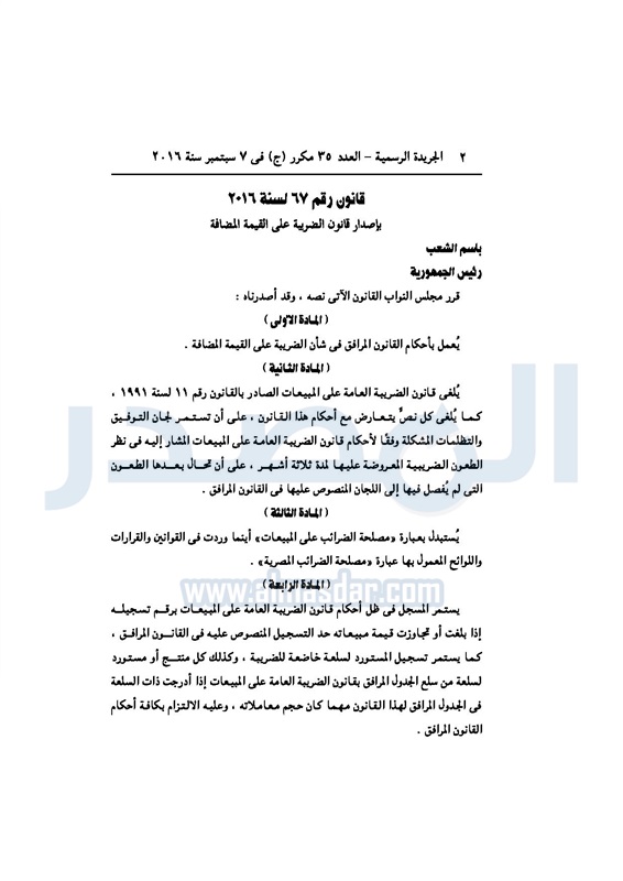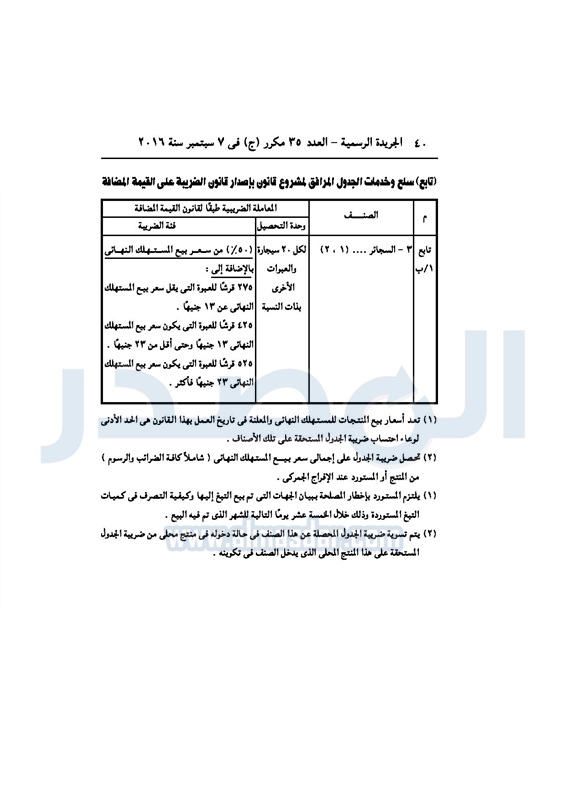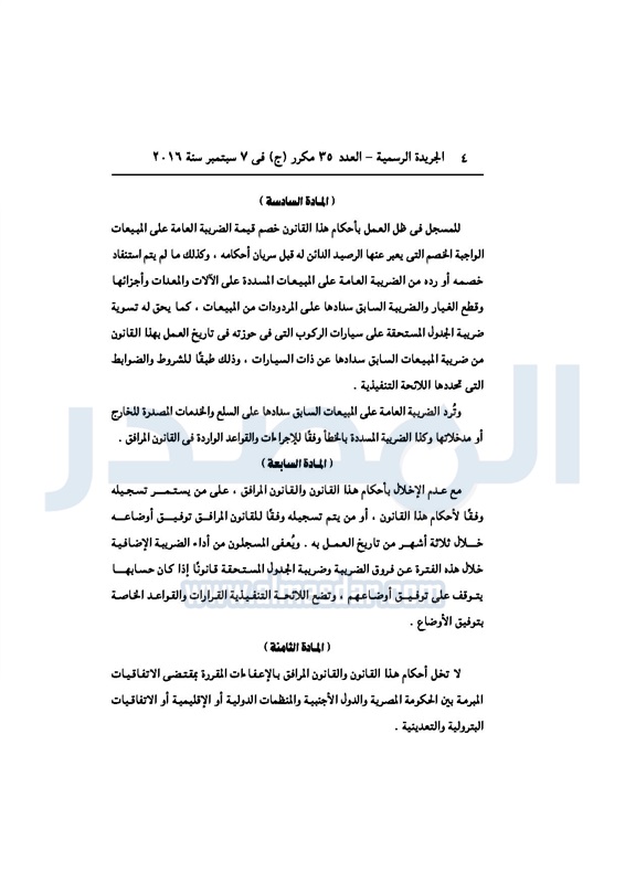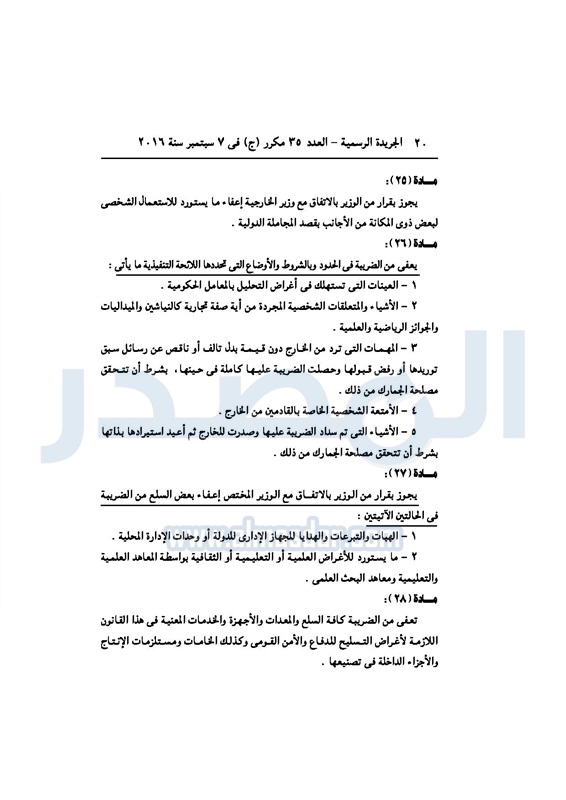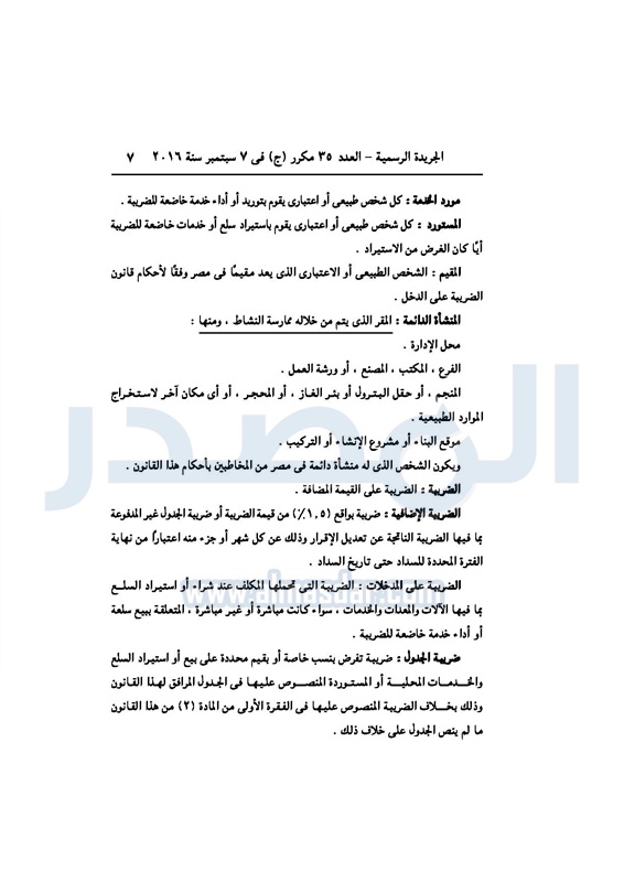 أخبار مصر السيسي يصدر قانون القيمة المضافة بعد موافقة البرلمان الخميس 08 سبتمبر 2016 - 02:51 م 9/8/2016 2:51:00 PM عبد الفتاح السيسي رئيس الجمهورية المصدر - خاص طباعة شارك نشرت الجريدة الرسمية في العدد رقم 35 مكرر "ج" الصادر في 7 سبتمبر 2016، قرار رئيس الجمهورية، رقم 67 لسنة 2016، بشأن إصدار قانون الضريبة على القيمة المضافة.لقراءة القرار: طباعة شارك مجلس النواب قانون القيمة المضافة القيمة المضافة السيسى الجريدة الرسمية البرلمان تابع المصدر علي جوجل نيوز تطبيق نبض