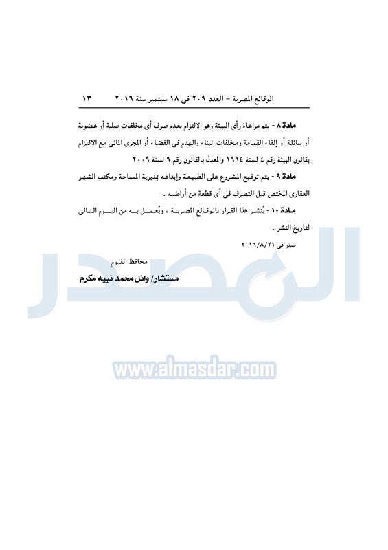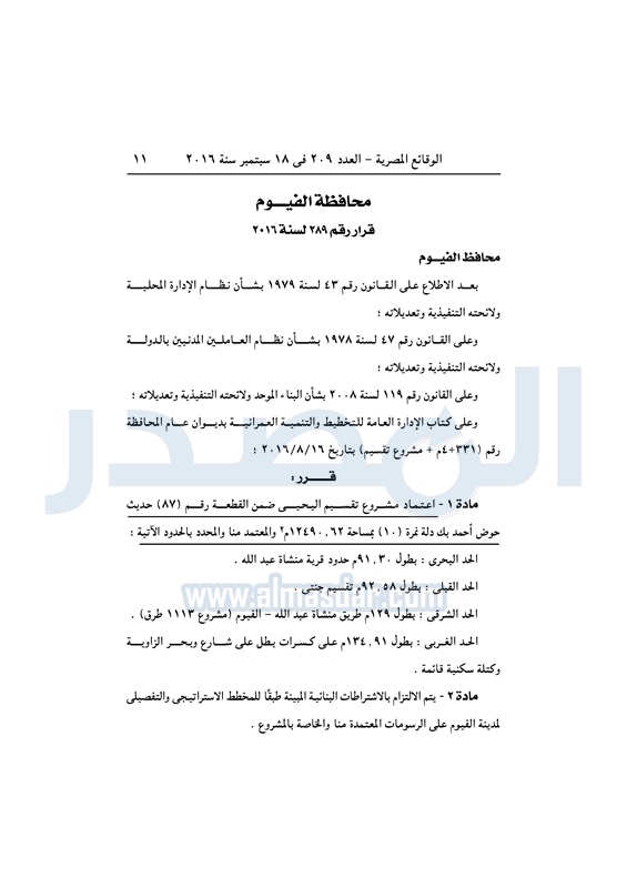 محافظات الفيوم تعتمد المخطط التفصيلي لمشروع تقسيم اليحيى الأحد 18 سبتمبر 2016 - 12:22 م 9/18/2016 12:22:00 PM محافظة الفيوم - أرشيفية المصدر - خاص طباعة شارك نشرت الوقائع المصرية فى العدد رقم 209 الصادر في 18 سبتمبر 2016، قرار محافظة الفيوم رقم 289 لسنة 2016، بشأن اعتماد المخطط التفصيلي لمشروع تقسيم اليحيى بمدينة الفيوم. لقراءة القرار: طباعة شارك محافظة الفيوم محافظ الفيوم الوقائع المصرية المخطط التفصيلي الفيوم التنمية العمرانية تابع المصدر علي جوجل نيوز تطبيق نبض