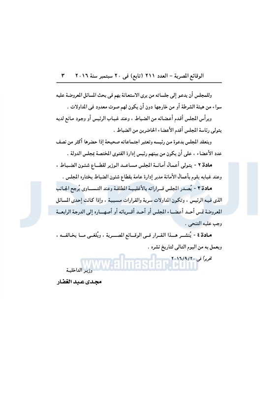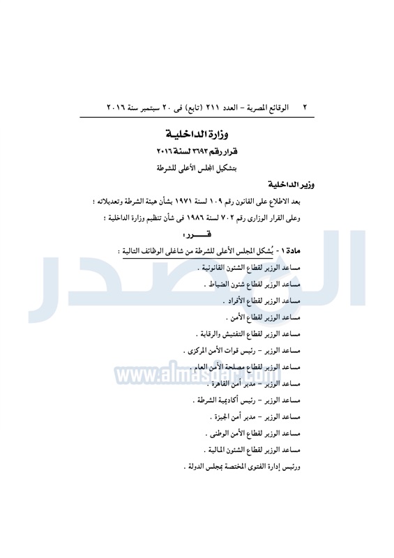 أخبار مصر "المصدر" تنشر التشكيل الجديد للمجلس الأعلى للشرطة الثلاثاء 20 سبتمبر 2016 - 05:41 م 9/20/2016 5:41:00 PM مجدي عبد الغفار - وزير الداخلية المصدر - خاص طباعة شارك نشرت الوقائع المصرية في العدد رقم 211 "تابع" الصادر في 20 سبتمبر 2016 ، قرار وزارة الداخلية رقم 3693 لسنة 2016، بشأن تشكيل المجلس الأعلى للشرطة .لقراءة القرار: طباعة شارك وزير الداخلية مجدي عبد الغفار الوقائع المصرية المجلس الأعلى للشرطة الشرطة الداخلية تابع المصدر علي جوجل نيوز تطبيق نبض