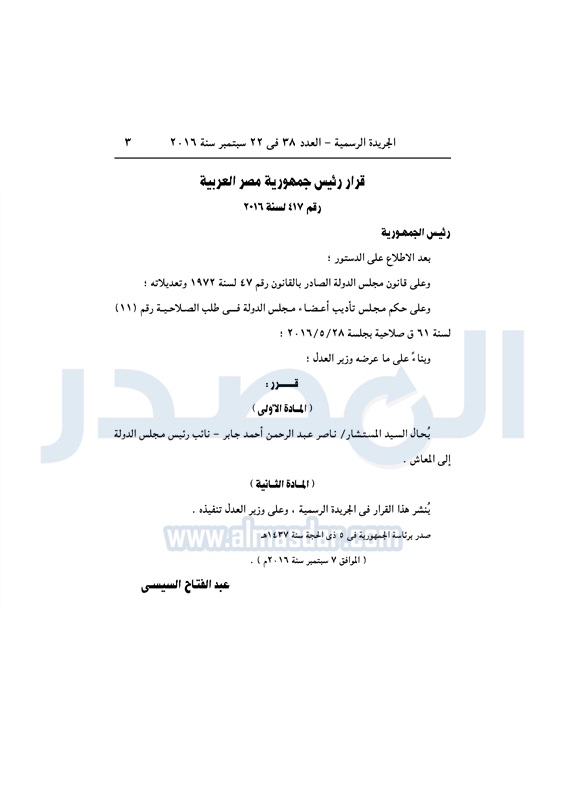 أخبار مصر السيسي يحيل نائب رئيس مجلس الدولة للمعاش الخميس 22 سبتمبر 2016 - 10:19 ص 9/22/2016 10:19:00 AM عبد الفتاح السيسي رئيس الجمهورية المصدر - خاص طباعة شارك نشرت الجريدة الرسمية في العدد رقم 38 الصادر في 22 سبتمبر 2016، قرار رئيس الجمهورية رقم 417 لسنة 2016، بشأن إحالة المستشار ناصر جابر، نائب رئيس مجلس الدولة إلي المعاش.لقراءة القرار: طباعة شارك نائب رئيس مجلس الدولة مجلس الدولة قرار جمهورى المعاشات السيسى الجريدة الرسمية تابع المصدر علي جوجل نيوز تطبيق نبض