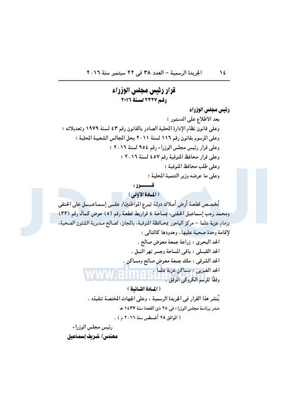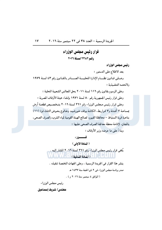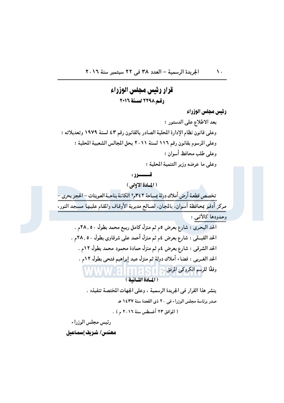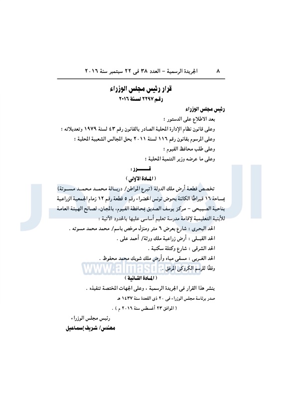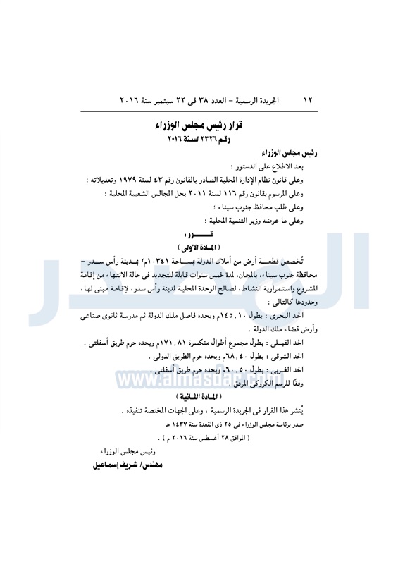 عقارات رئيس الوزراء يخصص قطع أراضي لعدد من الجهات الخميس 22 سبتمبر 2016 - 11:03 ص 9/22/2016 11:03:29 AM شريف إسماعيل رئيس الوزراء وكالات طباعة شارك نشرت الجريدة الرسمية في العدد رقم 38 الصادر في 22 سبتمبر 2016، قرارات رئيس مجلس الوزراء، بشأن تخصيص قطع أراضي لعدد من الجهات.لقراءة القرارات: طباعة شارك شريف اسماعيل رئيس الوزارء الجريدة الرسمية أراضى الدولة تابع المصدر علي جوجل نيوز تطبيق نبض