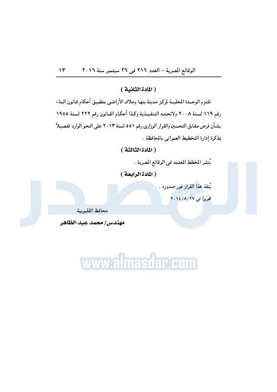 نشرت الوقائع المصرية في العدد رقم 216 الصادر في 26 سبتمبر 2016، قرار محافظة القليوبية، رقم 323 لسنة 2014، بشأن اعتماد المخطط التفصيلي لشبكة الطرق لجزء من مدينة بنها "منطقة شمال بنها" .