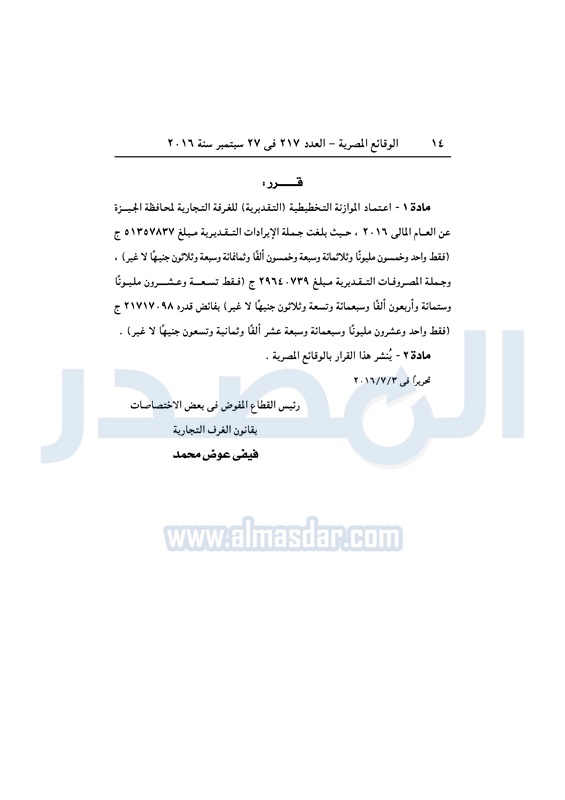 نشرت الوقائع المصرية في العدد رقم 217 الصادر في 27 سبتمبر 2016، قرارات وزارة التجارة والصناعة، رقم 25 و26 و27 و28 و29 لسنة 2016، بشأن باعتماد الموازنة التخطيطية "التقديرية" للغرفة التجارية لمحافظة دمياط والمنيا وبني سويف والجيزة وقنا.