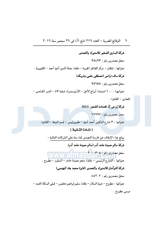نشرت الوقائع المصرية في العدد رقم 216 الصادر في 26 سبتمبر 2016، قرار وزارة التجارة والصناعة، رقم 860 لسنة 2016، بشأن توقيع جزاءات على بعض المصدرين لمخالفتهم أحكام القانون رقم 118 لسنه 1975.