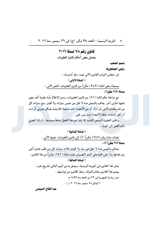 أخبار مصر السيسى يصدر قرارًا بتغليظ عقوبات ختان الإناث الأربعاء 28 سبتمبر 2016 - 11:07 م 9/28/2016 11:07:00 PM الرئيس عبد الفتاح السيسى المصدر - خاص طباعة شارك نشرت الجريدة الرسمية في العدد رقم 38 مكرر "ج" الصادر في 26 سبتمبر 2016، قرار رئيس الجمهورية رقم 78 لسنة 2016، بتعديل بعض احكام قانون العقوبات.لقراءة القرارا: طباعة شارك قانون العقوبات ختان الاناث السيسى تابع المصدر علي جوجل نيوز تطبيق نبض