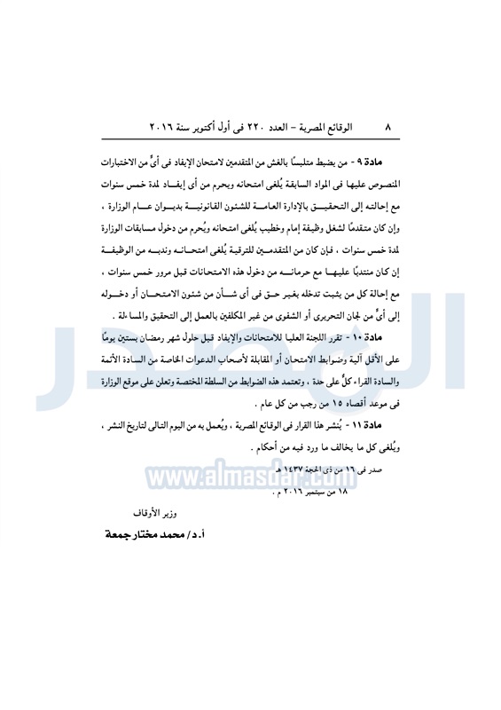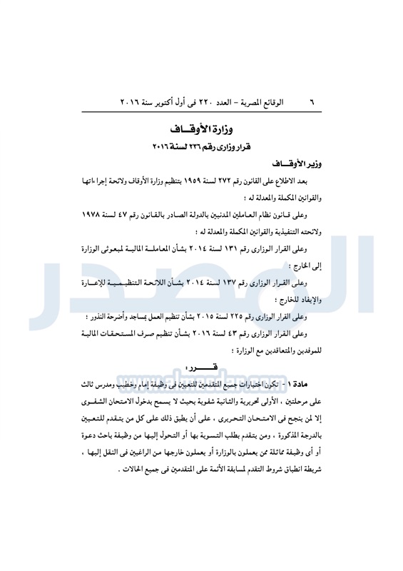 أخبار مصر "الأوقاف" تحدد شروط وضوابط المتقدمين للوظائف المختلفة الإثنين 03 أكتوبر 2016 - 09:57 ص 10/3/2016 9:57:00 AM وزارة الأوقاف - صورة أرشيفية المصدر - خاص طباعة شارك نشرت الوقائع المصرية في العدد رقم 220 الصادر في أول أكتوبر 2016، قرار وزارة الأوقاف رقم 236 لسنة 2016، بشأن تحديد ضوابط وشروط المتقدمين للوظائف المختلفة.لقراءة القرار: طباعة شارك وظائف حكومية وزير الاوقاف الايفاد الاوقاف تابع المصدر علي جوجل نيوز تطبيق نبض