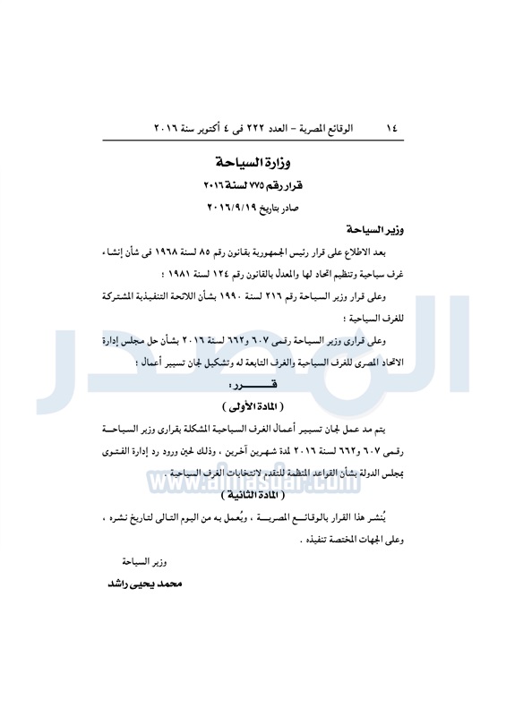 سياحة و طيران مد عمل لجان تسيير أعمال الغرف السياحية شهرين الثلاثاء 04 أكتوبر 2016 - 10:45 ص 10/4/2016 10:45:00 AM يحيى راشد - وزير السياحة المصدر - خاص طباعة شارك نشرت الوقائع المصرية في العدد 222 الصادر في 4 أكتوبر 2016، قرار وزارة السياحة رقم 775 لسنة 2016، بشأن مد عمل لجان تسيير أعمال الغرف السياحية لمدة شهرين.لقراءة القرار: طباعة شارك يحيى راشد وزير السياحه الوقائع المصرية الغرف السياحية تابع المصدر علي جوجل نيوز تطبيق نبض