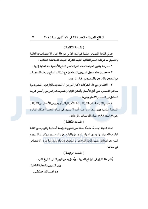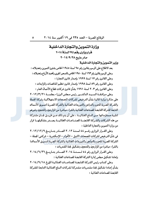 نشرت جريده الوقائع المصرية قرار وزاري رقم 295 لسنه 2014 بعد الاطلاع علي المرسوم بقانون رقم 95 لسنه 1945 الخاص بشئون التموين وتعديلاته وعلي المرسوم بقانون رقم 163 لسنه 1950 الخاص بالتسعير الجبري وتحديد الارباح وتعديلاته ، والقانون رقم 17 لسنه 1999 باصدار قانون التجاره، و القانون رقم 89 لسنه لسنه 1998 باصدار قانون تنظيم المناقصات والمزايدات.