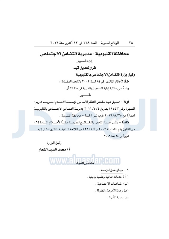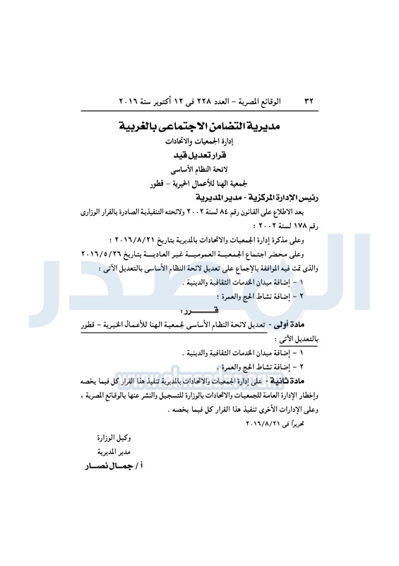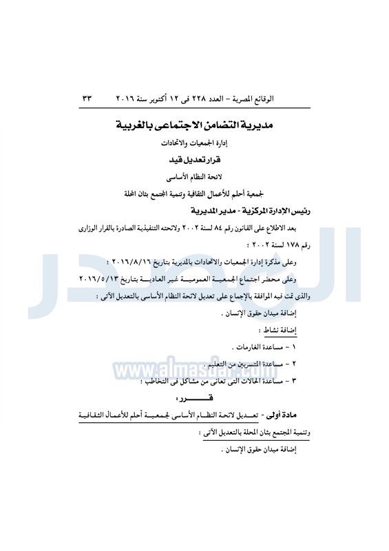 محافظات "التضامن" تقيد وتعدل لوائح عدد من الجمعيات بالمحافظات الأربعاء 12 أكتوبر 2016 - 12:17 م 10/12/2016 12:17:00 PM وزارة التضامن الاجتماعي - أرشيفية طباعة شارك نشرت الوقائع المصرية في العدد رقم 228 الصادر في 12 أكتوبر لسنة 2016، قرارات مدريات التضامن الاجتماعي بالمحافظات بشأن قيد وتعديل لائحة النظام الأساسي لعدد من الجمعيات.لقراءة القرارات: طباعة شارك الوقائع المصرية المحافظات الجمعيات الأهلية التضامن الاجتماعي تابع المصدر علي جوجل نيوز تطبيق نبض